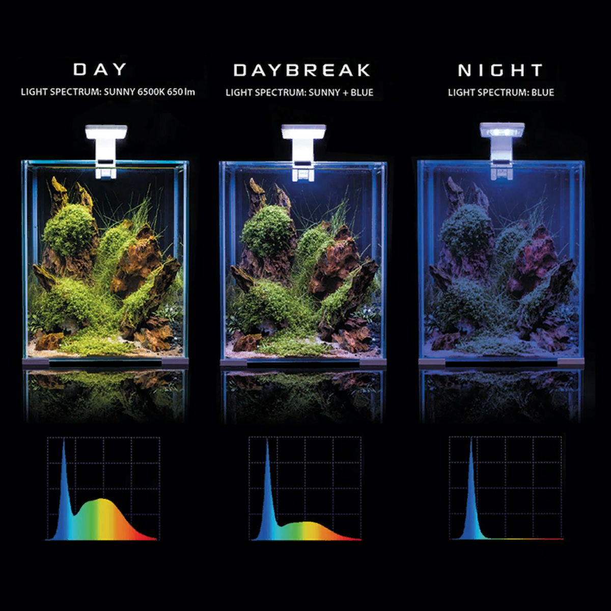 Дневное освещение создано при помощи диодов SUNNY (6.500 К/650 Люм), рассвет имитируется сочетанием диодов SUNNY+BLUE, а ночь синими диодами BLUE.