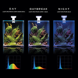 Для освещения в аквариуме предусмотрен светодиодный светильник с возможностью выбора трех режимов ДЕНЬ-РАССВЕТ-НОЧЬ.