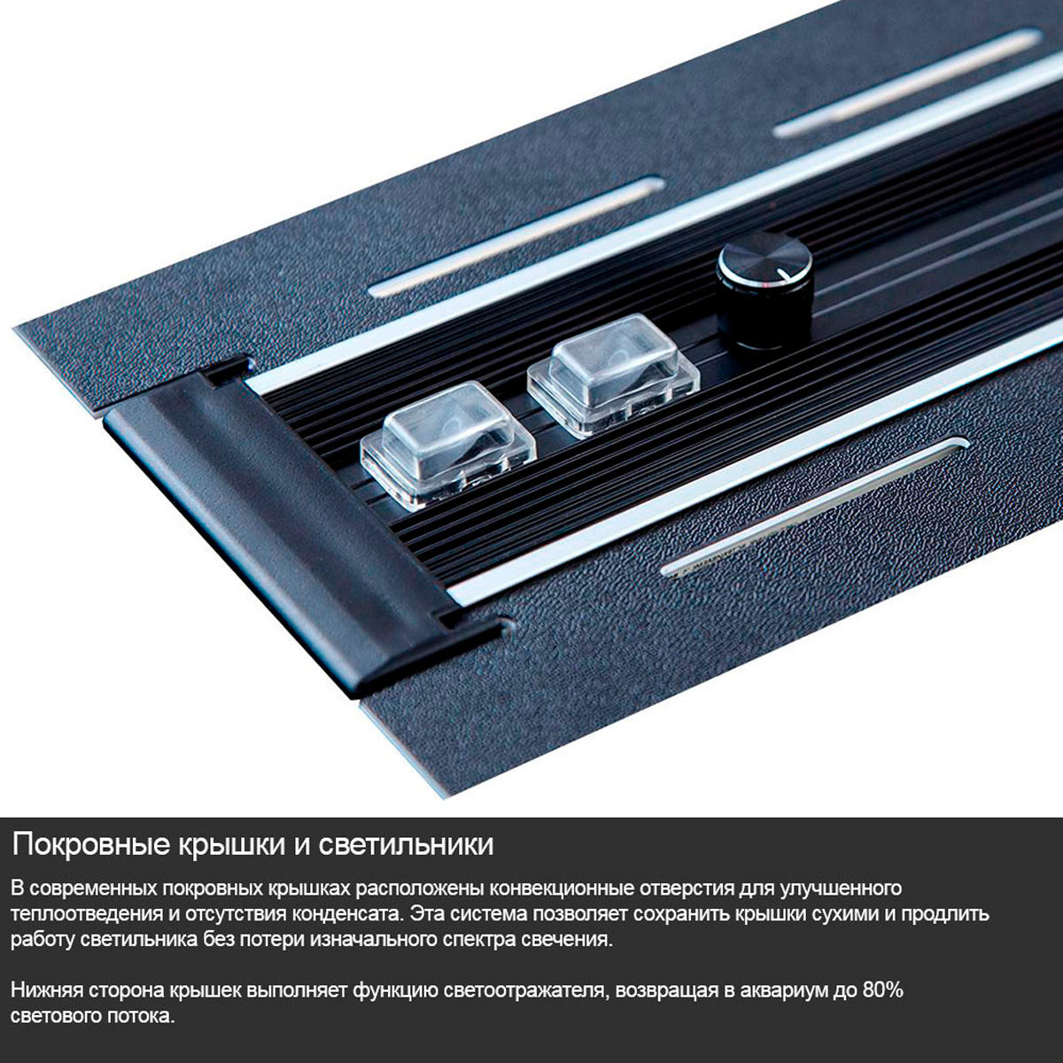 - Покровные крышки и светильники. В современных покровных крышках расположены конвекционные отверстия для улучшенного теплоотведения и отсутствия конденсата. Эта система позволяет сохранить крышки сухими и продлить работу светильника без потери изначального спектра свечения. Нижняя сторона крышек выполняет функцию светоотражателя, возвращая в аквариум до 90 % светового потока.