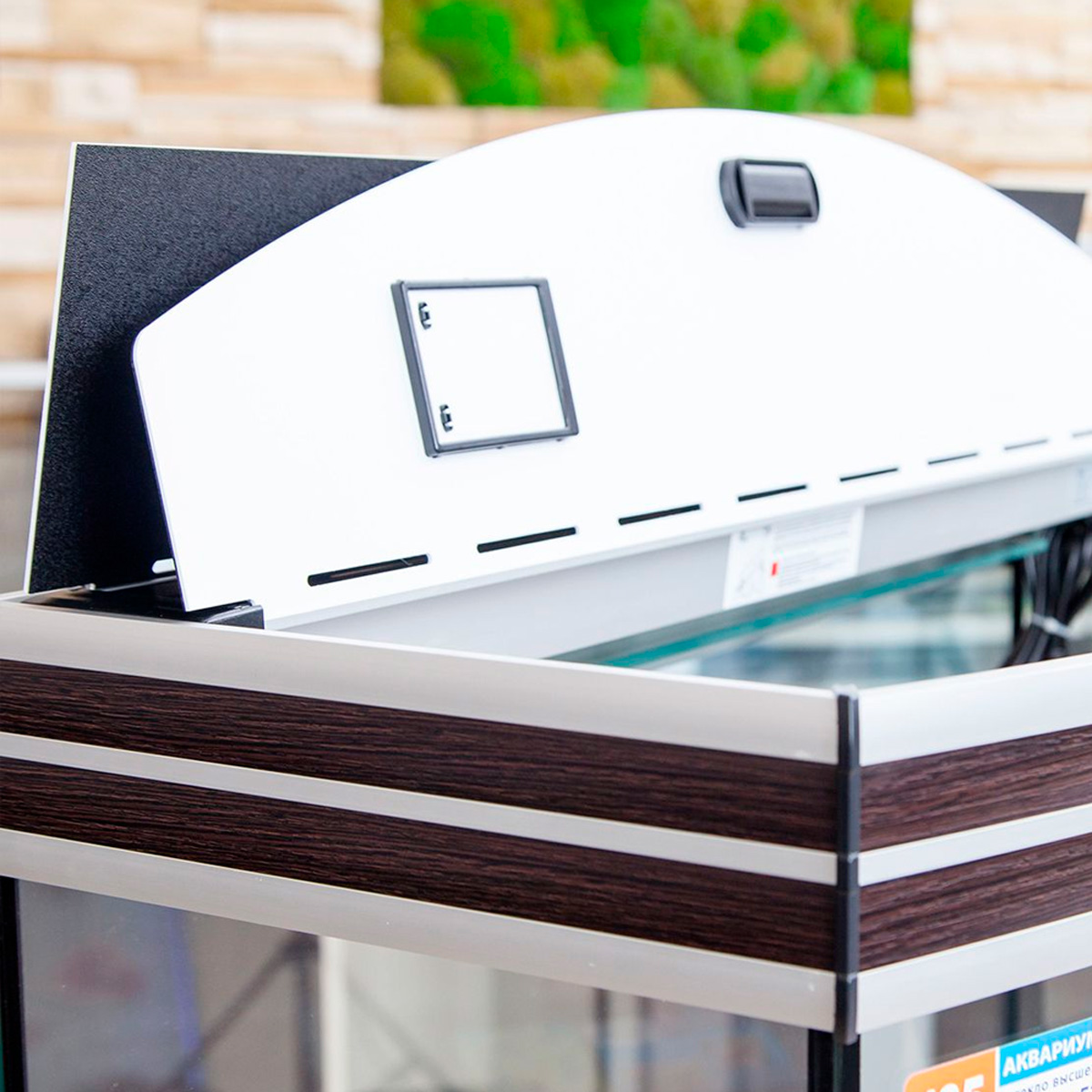 - Простота обслуживания. Крышка аквариумов Биодизайн оснащена двумя покровными крышками (створками). При обслуживании аквариума Вам не придется искать место, куда положить крышки, они легко открываются и фиксируются в вертикальном положении. Створки полностью съемные. Светильник отодвигается, открывая достаточно места для обслуживания. Выключать свет при этом не требуется, так как светильники полностью гидроизолированы и абсолютно безопасны. Это позволит Вам работать в хорошо освещенном аквариуме.