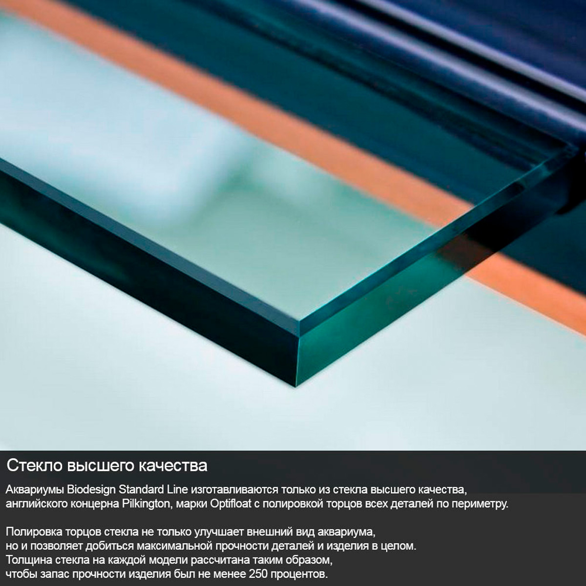 - Стекло высшего качества. Аквариумы Biodesign изготавливаются только из стекла высшего качества английского концерна Pilkington марки Optifloat с полировкой торцов всех деталей по периметру. Полировка торцов стекла не только улучшает внешний вид аквариума, но и позволяет добиться максимальной прочности деталей и изделия в целом. Толщина стекла на каждой модели рассчитана таким образом, чтобы запас прочности изделия был не менее 250 %.