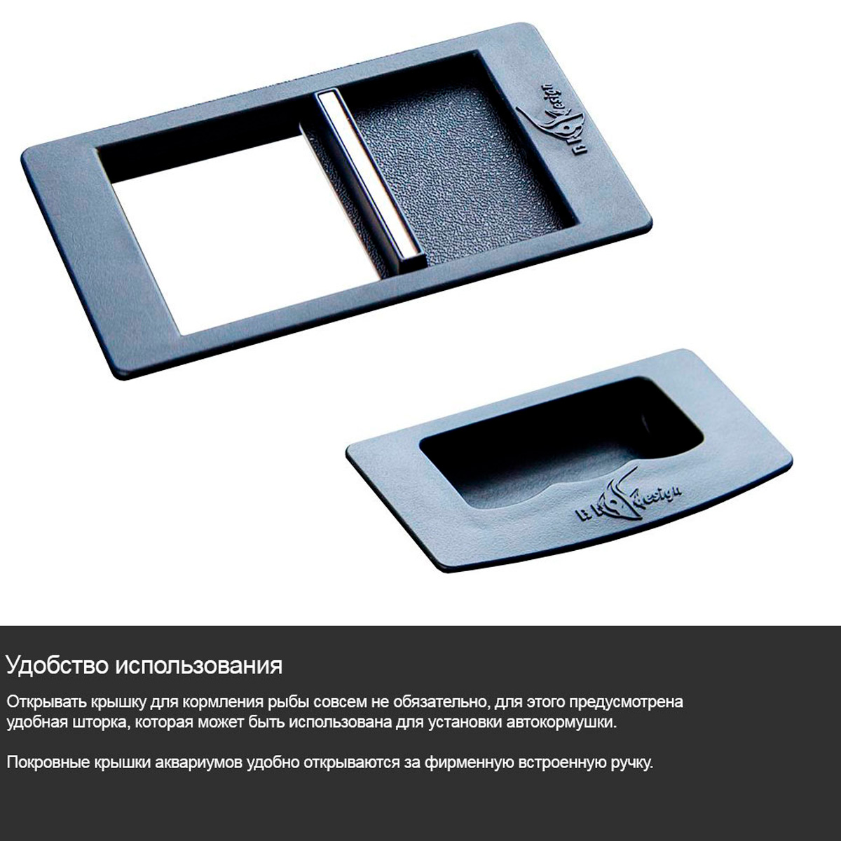 - Удобство использования. Открывать крышку (створки) для кормления рыбы совсем не обязательно, для этого предусмотрена удобная шторка (лючок), которая может быть использована для установки автокормушки. Покровные крышки аквариумов удобно открываются за фирменную встроенную ручку.