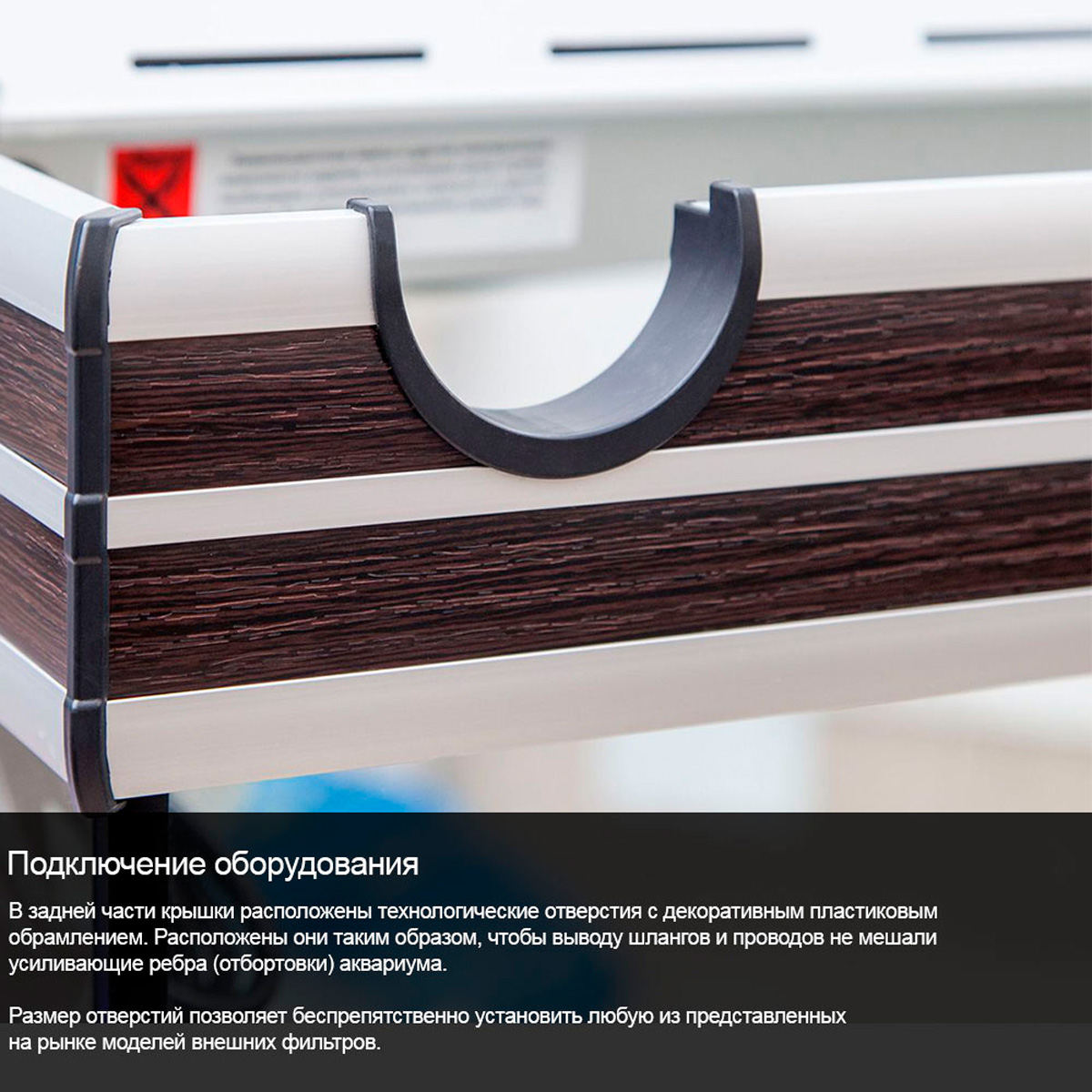 - Подключение оборудования. В задней части крышки расположены технологические отверстия с декоративным пластиковым обрамлением. Размер отверстий позволяет беспрепятственно установить любую из представленных на рынке моделей внешних фильтров.