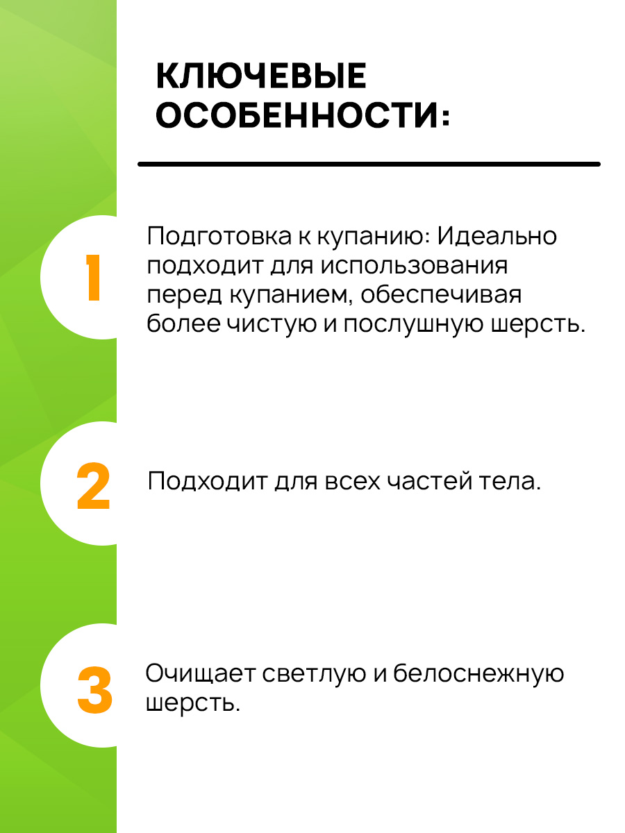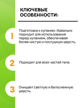 - Подготовка к купанию: Идеально подходит для использования перед купанием, обеспечивая более чистую и послушную шерсть.