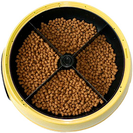 Автоматическая программируемая кормушка для домашних животных с ЖК-дисплеем.Миска с кормом разделена на 4 сектора (лотка). В зависимости от запрограммированного времени миска вращается, лотки поочередно открываются и еда становится доступной.