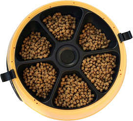 Автоматическая программируемая кормушка на 6 кормлений для домашних животных с ЖК-дисплеем.Миска с кормом разделена на 6 секторов (лотков). В зависимости от запрограммированного времени миска вращается, лотки поочередно открываются и еда становится доступной.