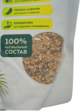 В состав рациона входит комплекс витаминов для крепкого здоровья, семена сафлора для яркого оперения, пробиотики для здорового пищеварения.