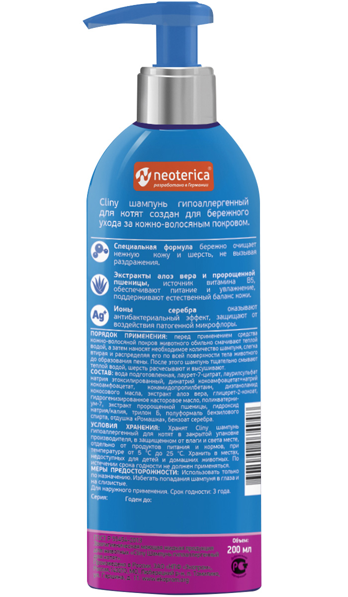 Cliny — это первая серия по уходу за животными с ионами серебра. Ионы серебра обладают мощным бактерицидным действием широкого спектра, не вызывают аллергии. Cliny — и гигиена, и профилактика болезней.