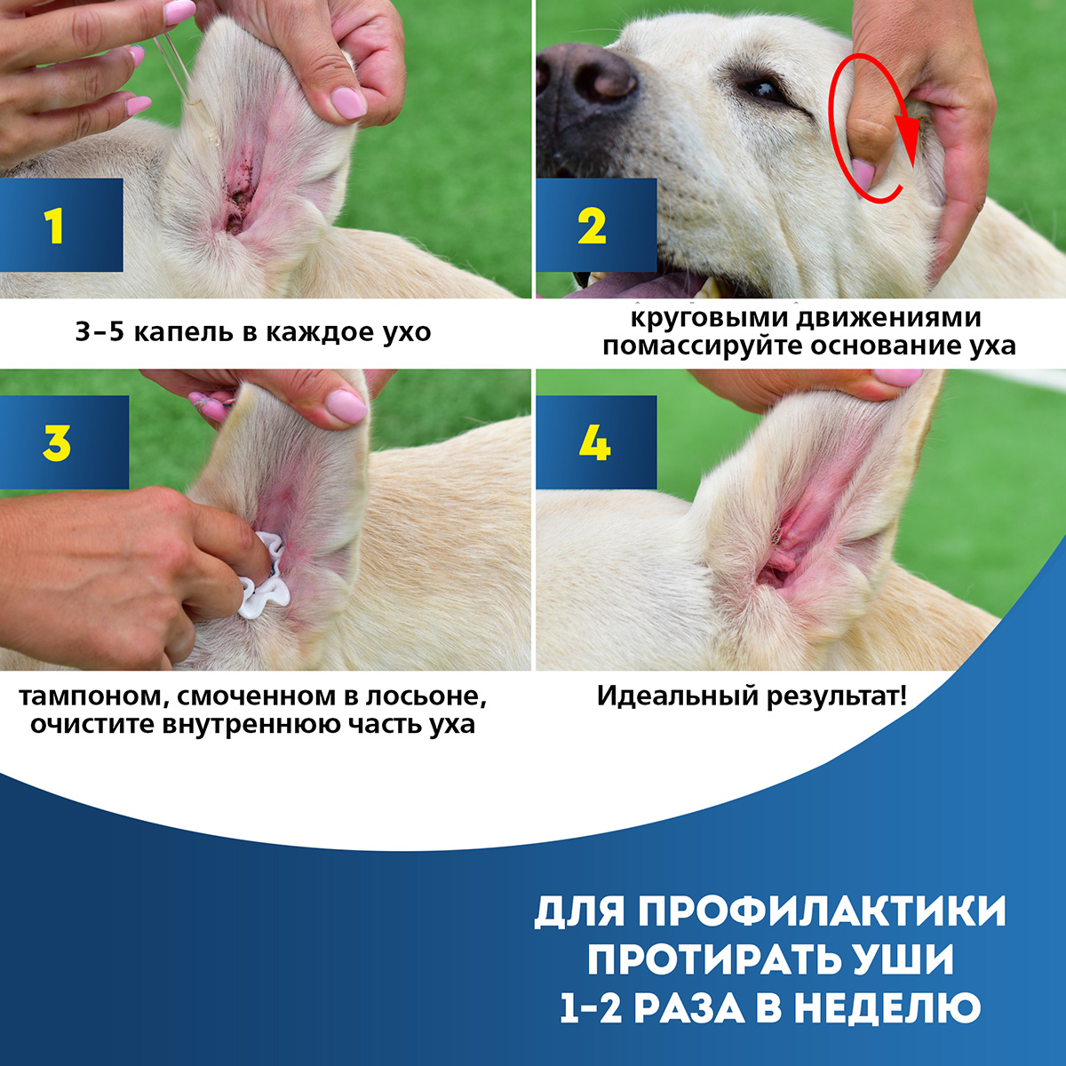 Закапайте 3–5 капель лосьона в ухо животному и круговыми движениями помассируйте основание ушной раковины. Затем ватным тампоном, смоченным в лосьоне, протрите внутреннюю поверхность ушной раковины и наружный слуховой проход.
