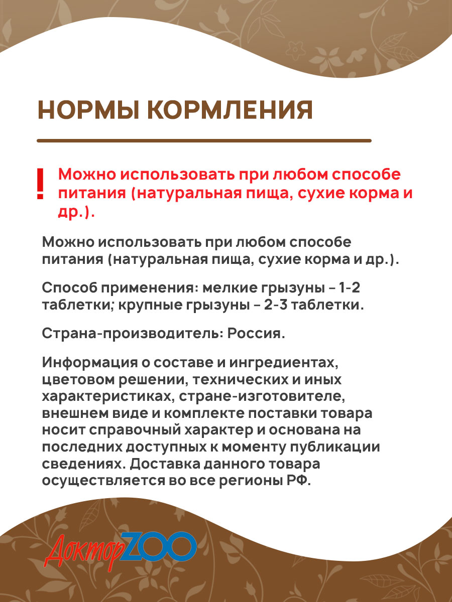 Рекомендации по кормлению: Можно использовать при любом способе питания (натуральная пища, сухие корма и др.).
