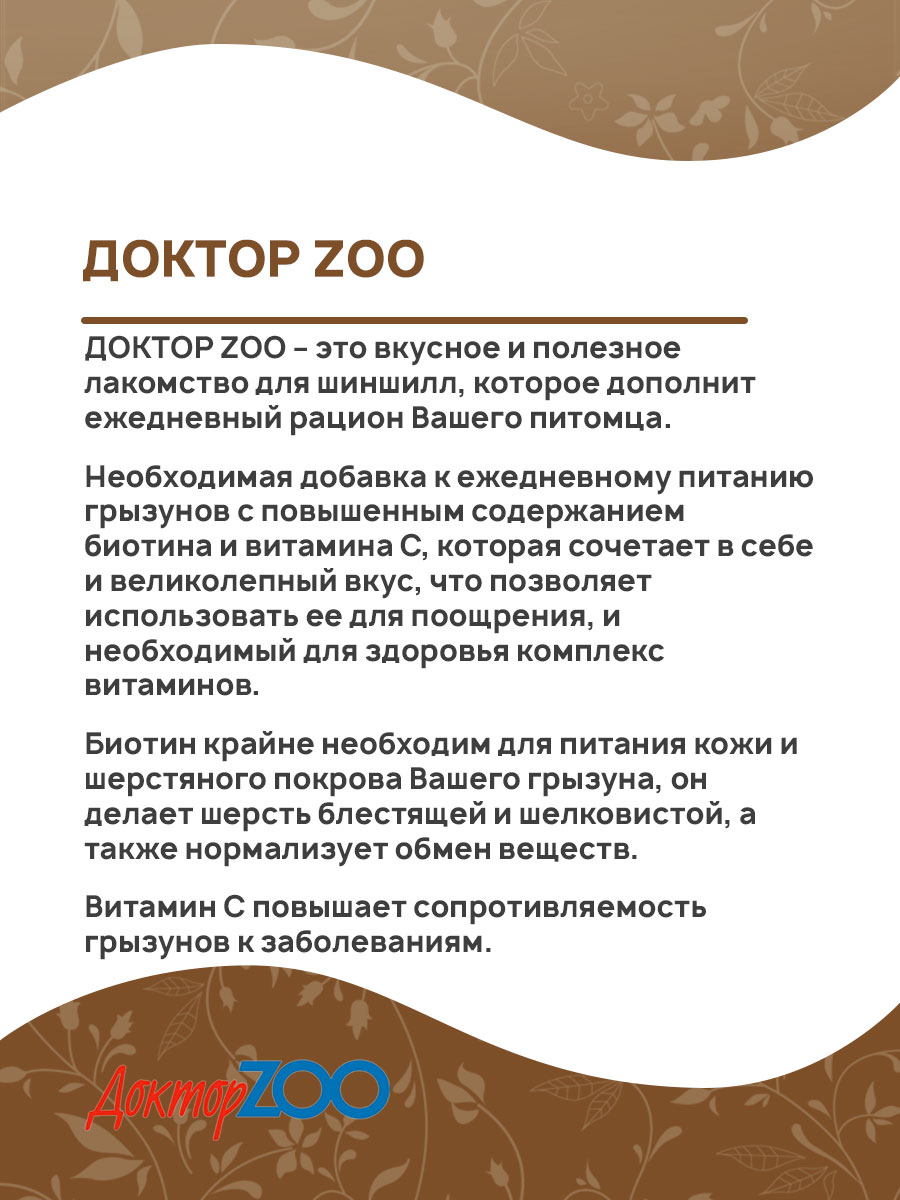 ДОКТОР ZOO – это вкусное и полезное лакомство для шиншилл, которое дополнит ежедневный рацион Вашего питомца.