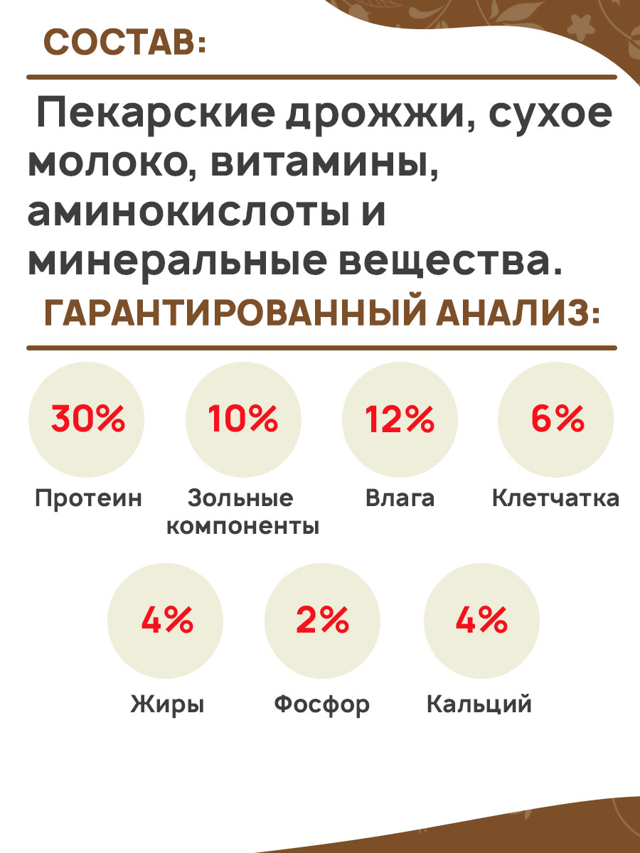 Состав: Пекарские дрожжи, сухое молоко, витамины, аминокислоты и минеральные вещества.