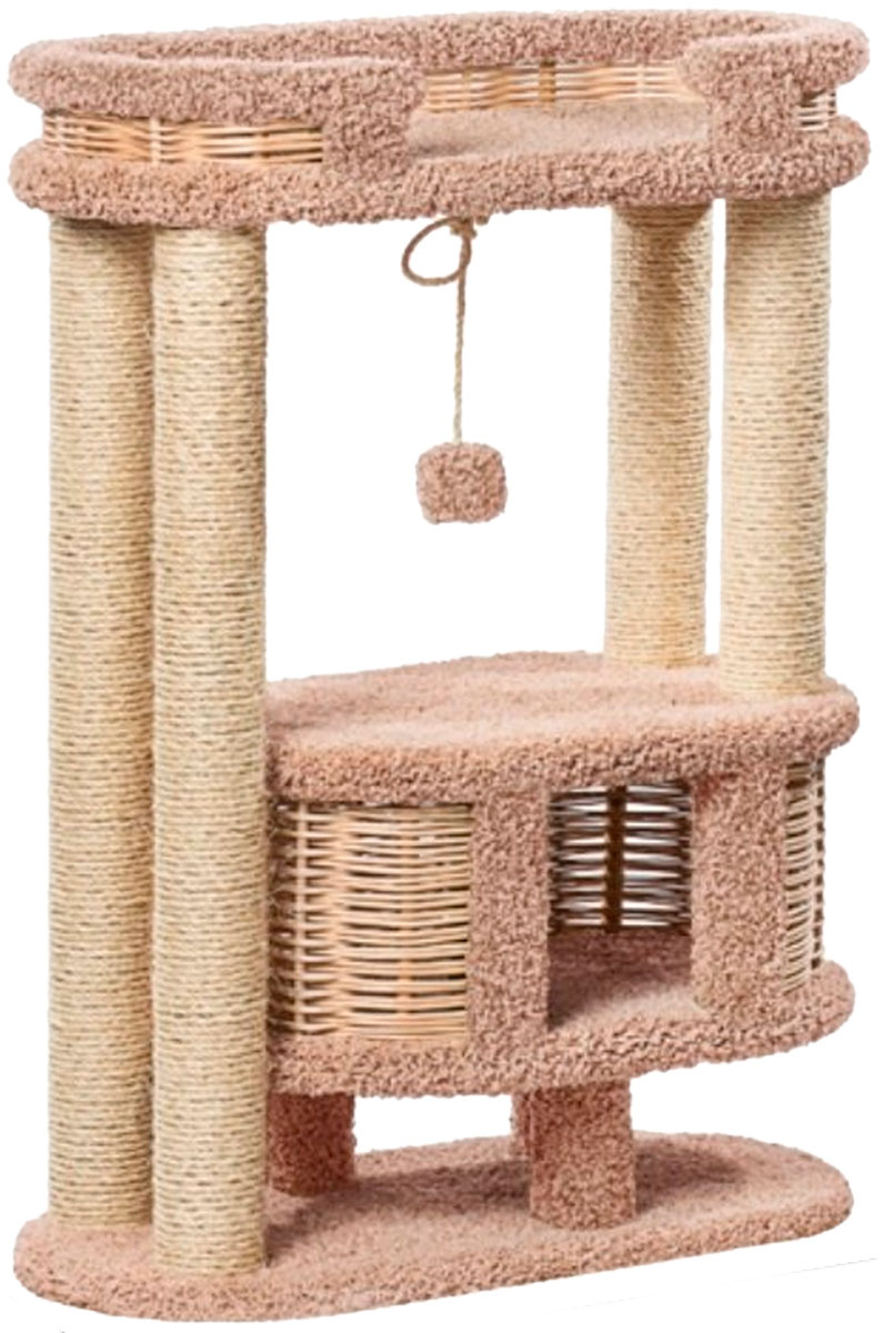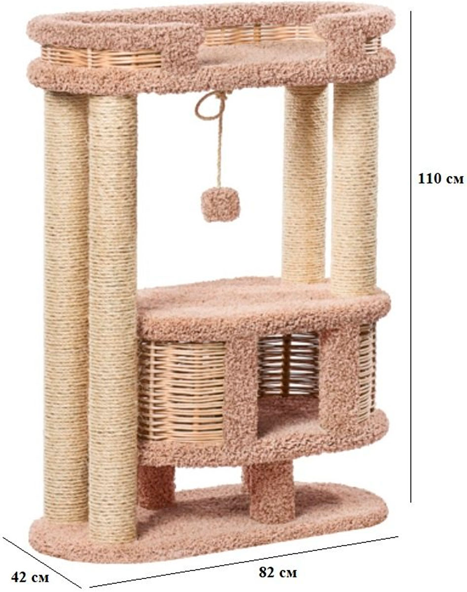 Шикарные просторные апартаменты, обитые ковролином и оснащенные когтеточками для Вашего любимца. Наверху удобная большая лежанка, откуда так интересно наблюдать за происходящими вокруг событиями! Внизу – большой уютный плетеный домик, где так хорошо поспать или просто спрятаться.