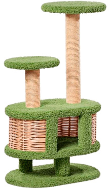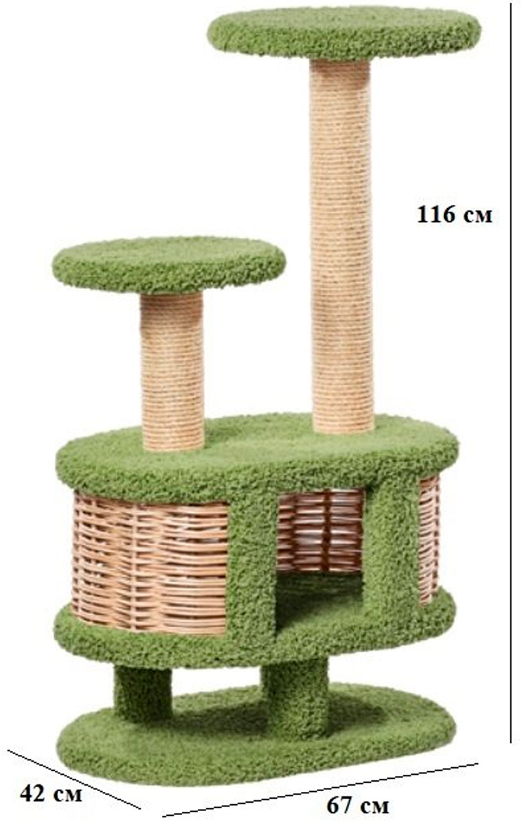 Уютный комплекс, обитый ковролином и оснащенный когтеточками для Вашего любимца. Наверху удобная большая лежанка и ступенька, откуда так интересно наблюдать за происходящими вокруг событиями! Внизу – уютный плетеный домик, где так хорошо поспать или просто спрятаться.