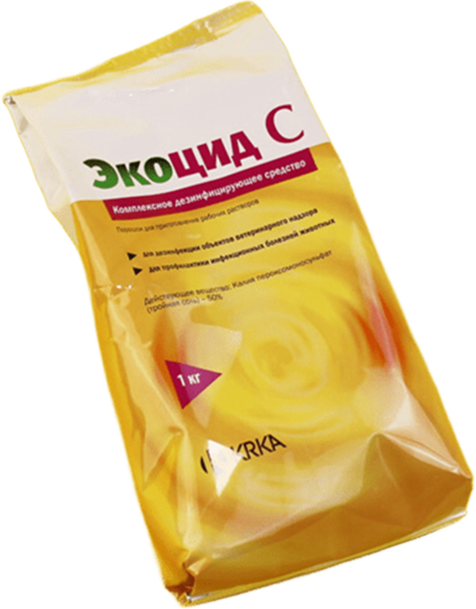 Экоцид С - комплексное дезинфицирующее средство в форме порошка, содержащее в 1 г в качестве действующего вещества 500 мг калия пероксомоносульфата (тройная соль), а в качестве вспомогательных компонентов: поверхностно-активное вещество - додецилбензол сульфонат натрия, органические кислоты, неорганические буферные системы (хлорид натрия, полифосфат натрия), краситель и отдушку цитрусовую.