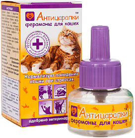Феромоны АНТИЦАРАПКИ - это синтетический аналог феромонов лицевых желез кошек, который успокаивает и улучшает настроение животного, помогая ему справиться с изменениями окружающей обстановки и другими стрессовыми ситуациями.