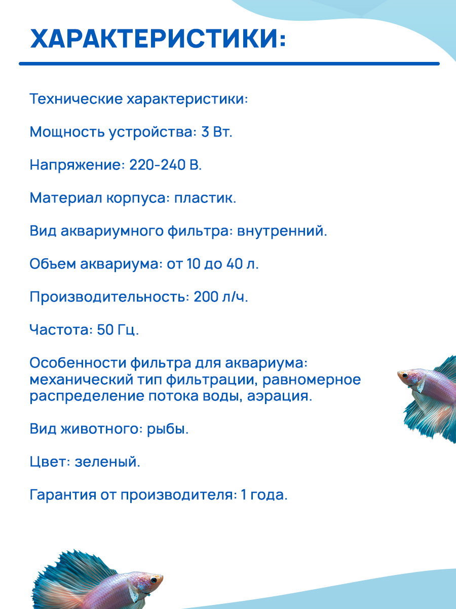 Внутренний фильтр для аквариумов объемом от 10 до 40 литров.