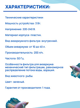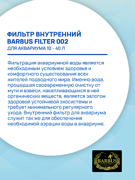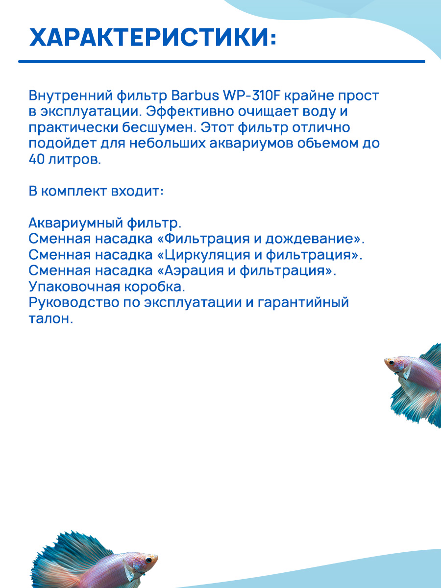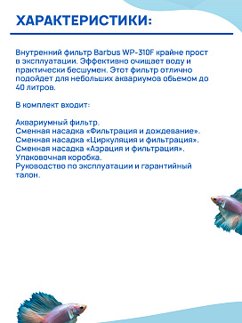 Внутренний фильтр Barbus WP-310F крайне прост в эксплуатации. Эффективно очищает воду и практически бесшумен. Этот фильтр отлично подойдет для небольших аквариумов объемом до 40 литров.