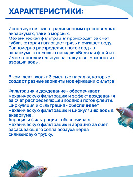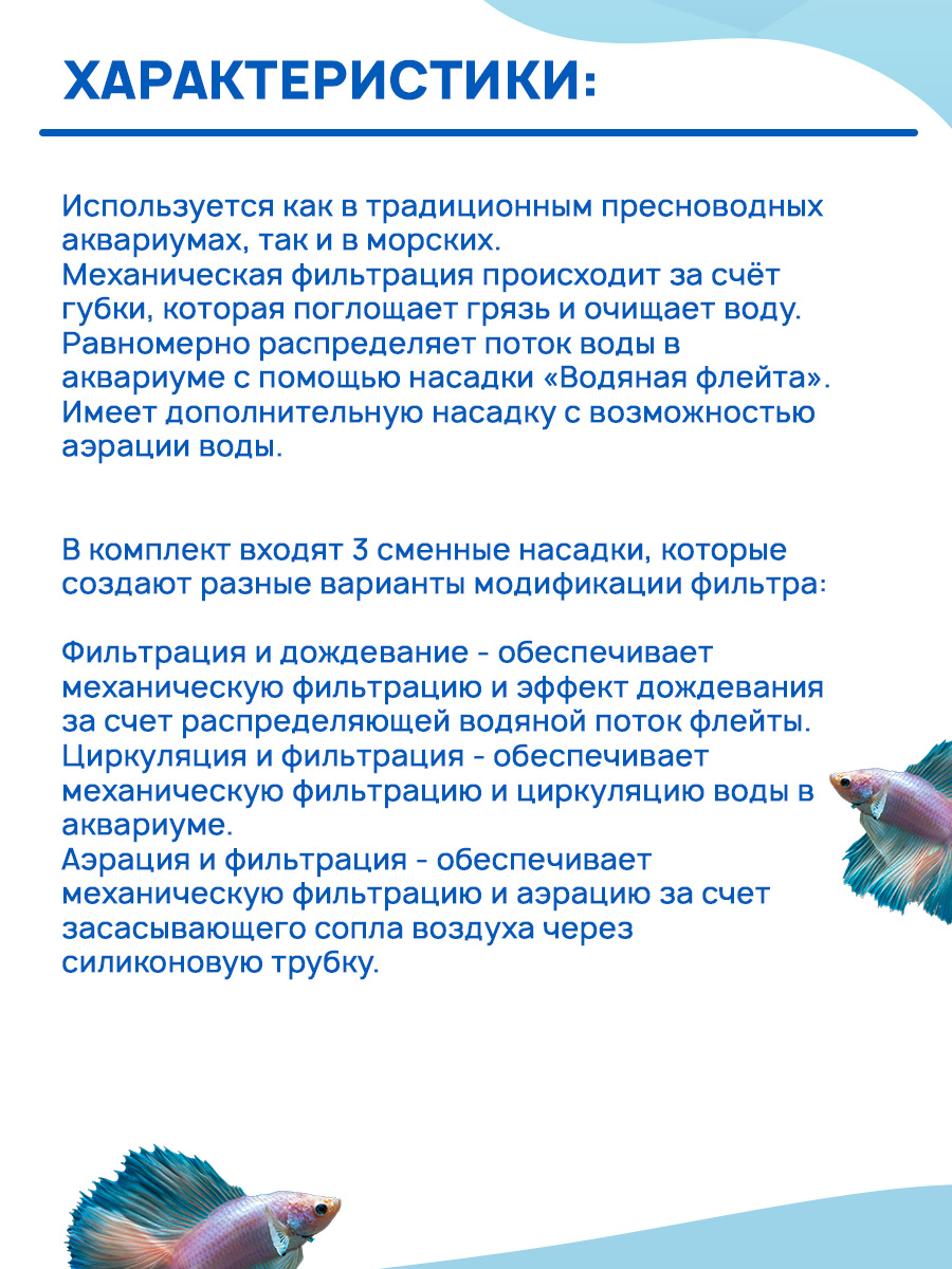 - Равномерно распределяет поток воды в аквариуме с помощью насадки «Водяная флейта».