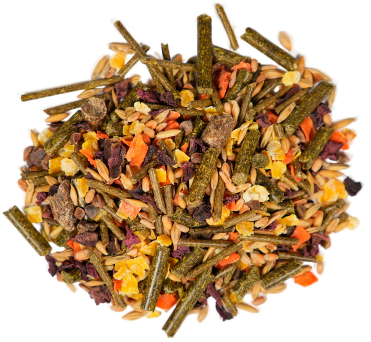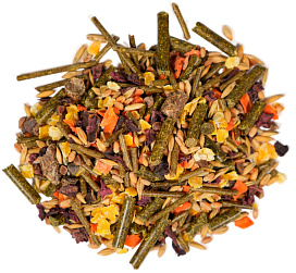 - Содержит различные виды злаков, гранулы сена, арахис, мангольд, люцерновую муку, семена подсолнечника, кэроб.