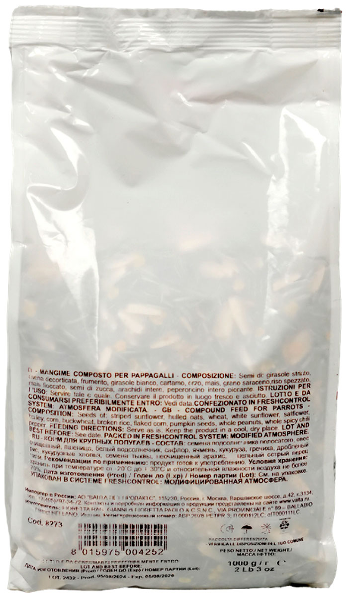 - Корм содержит различные семена, которые составляют разнообразный и полезный рацион попугаев.