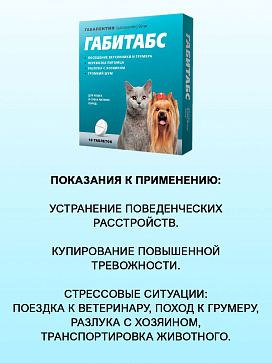 ГАБИТАБС применяют для устранения поведенческих расстройств, купирования повышенной тревожности, в том числе при проведении диагностических исследований, транспортировке и груминге у собак и кошек.