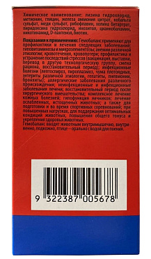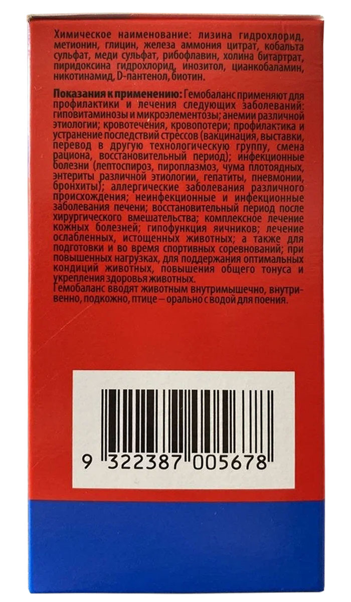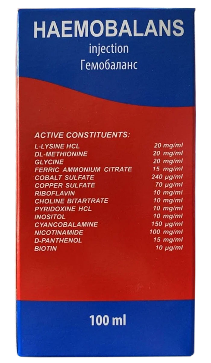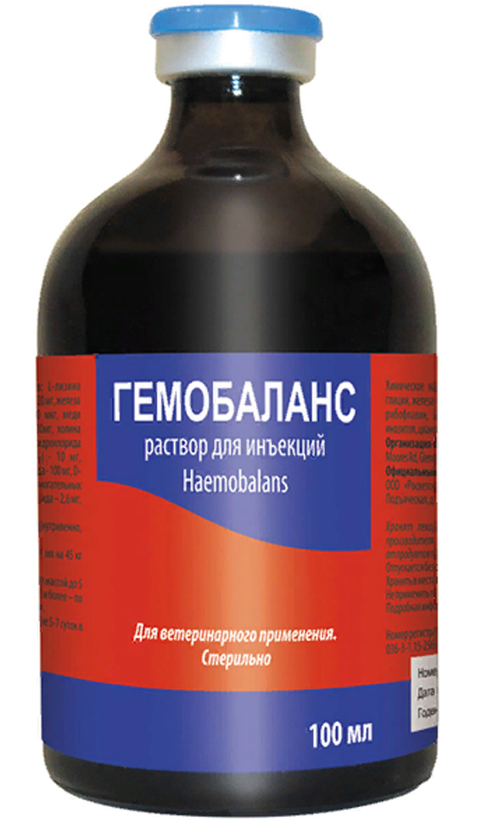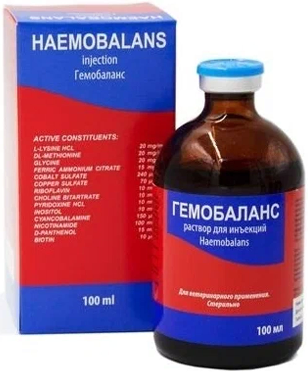 Гемобаланс содержит комплекс витаминов, микроэлементов и аминокислот и применяется для лечения заболеваний, возникающих вследствие недостатка этих веществ в рационе. Препарат используют также для поддержания оптимальных кондиций животных и для ускорения выздоровления после различных болезней.Применяется для всех видов домашних и сельскохозяйственных животных.