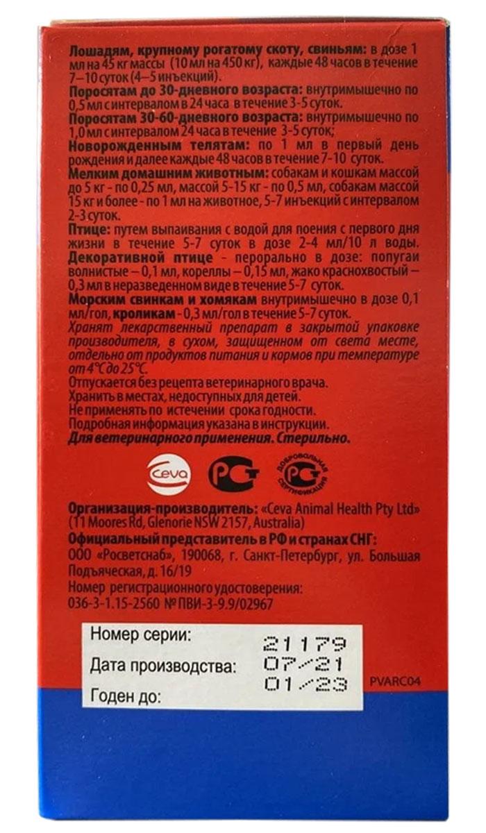 Крупному рогатому скоту, свиньям: 1 мл на 45 кг живой массы (10 мл на 450 кг) каждые 48 часов в течение 7 – 10 дней (4 – 5 инъекций).