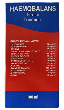 1.1. Гемобаланс – дополнительное парентеральное питание для животных и птицы - комплексный препарат, основным действующими веществами которого являются: В2 (рибофлавин), В4 (холина битартрат), В6 (пиридоксина гидрохлорид), В8 (инозитол), В12 (цианкобаламин), Н (биотин), никотинамид, D-пантенол, кобальта сульфат, меди сульфат, DL-метионин, L-лизина гидрохлорид, глицин, железа аммония цитрат.