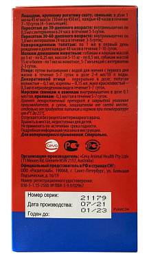 Птице: из расчета 1 мл на 15 кг живой массы один раз в два-три дня в течение 7-10 дней. Развести в воде, применять путем выпаивания.