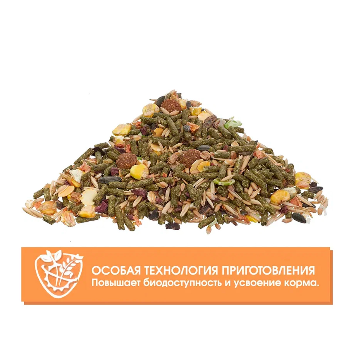 Сбалансированные смеси на основе зерна, трав, зерновых и травяных гранул с добавлением фруктов, овощей, ягод, арахиса и ракушечника обеспечат животное всеми необходимыми питательными веществами.
