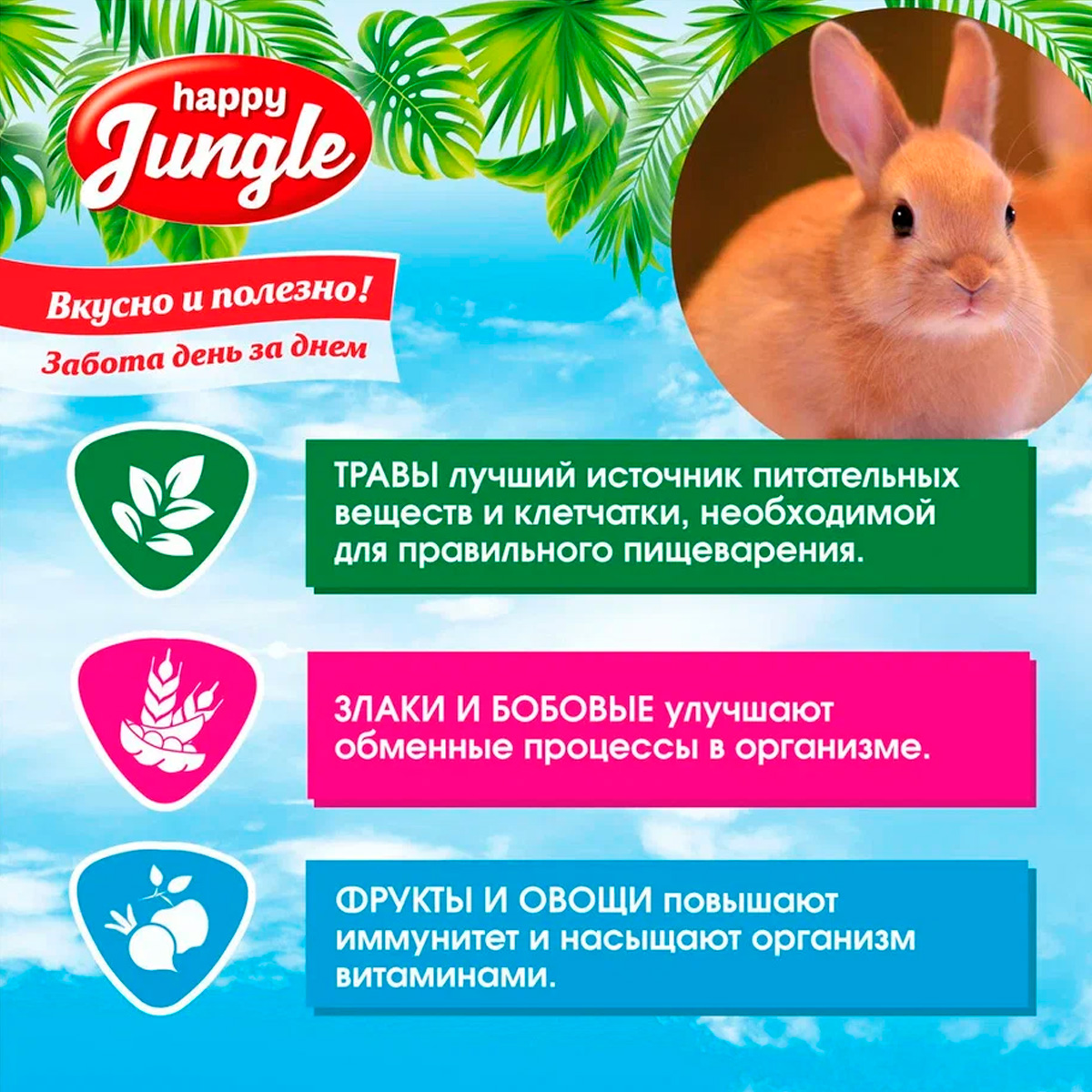 HAPPY JUNGLE – это линейка сухих кормов для грызунов, кроликов и декоративных птиц.
