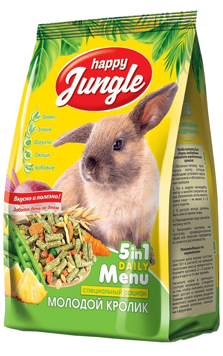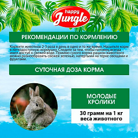 Корм HAPPY JUNGLE для молодых кроликов в возрасте до 6 месяцев – это сбалансированная смесь из травяных гранул, зерна, овощей и фруктов, которая обеспечит Вашего питомца всеми питательными веществами, необходимыми для здоровья и правильного роста.