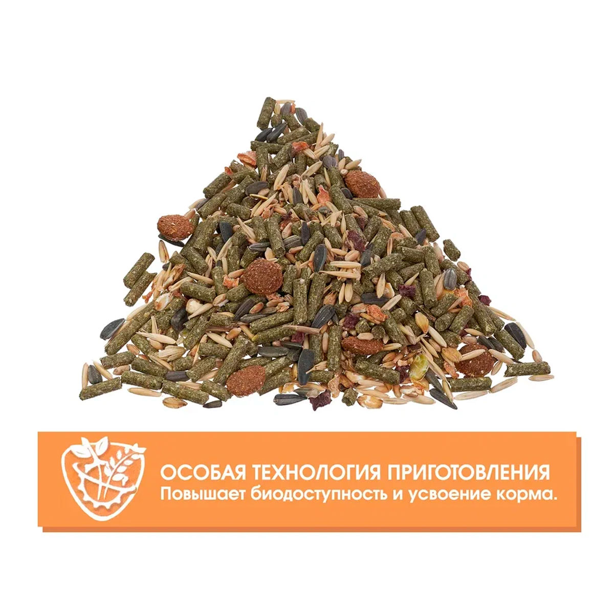 Сбалансированные смеси на основе зерна, трав, зерновых и травяных гранул с добавлением фруктов, овощей, ягод, арахиса и ракушечника обеспечат животное всеми необходимыми питательными веществами.