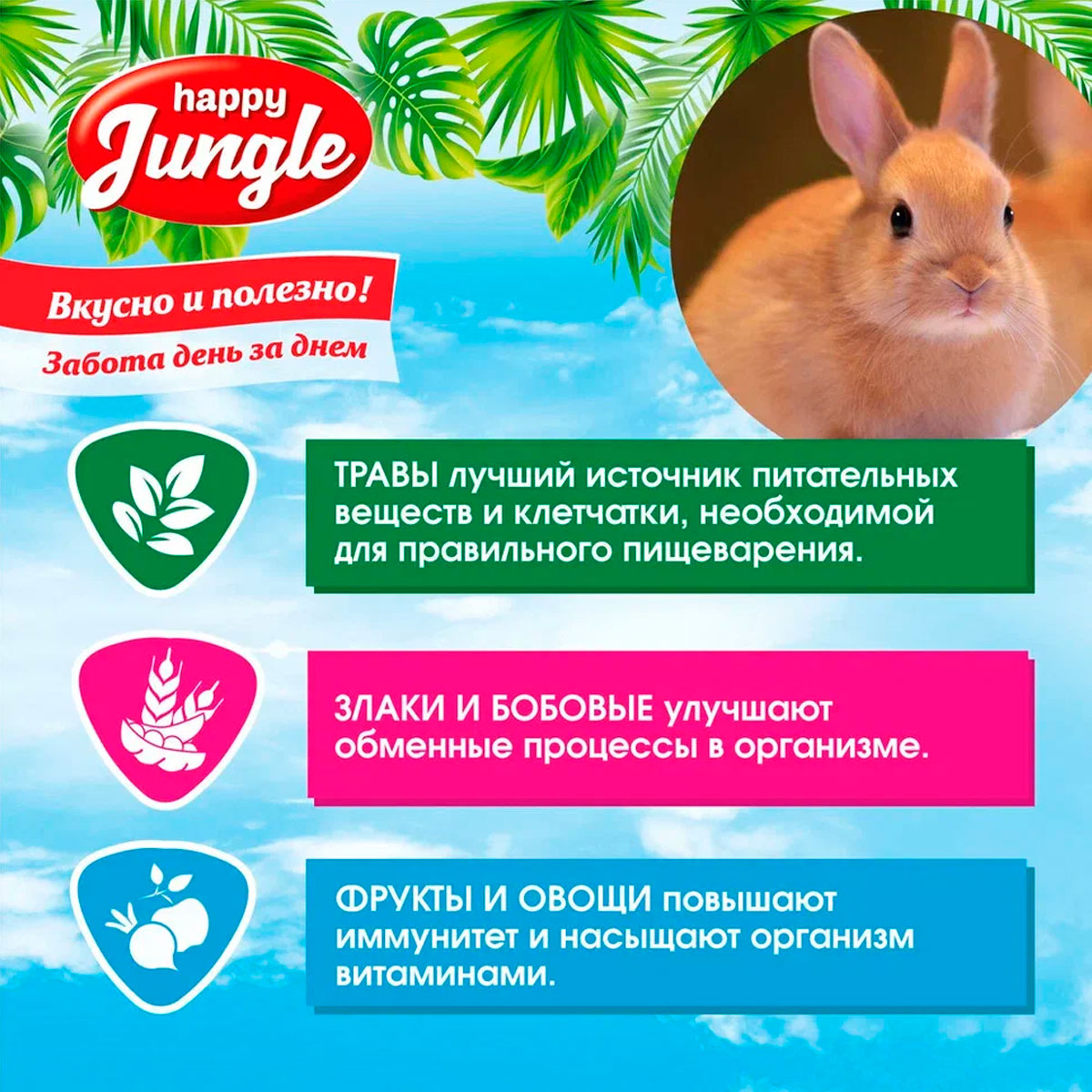 HAPPY JUNGLE – это линейка сухих кормов для грызунов, кроликов и декоративных птиц.