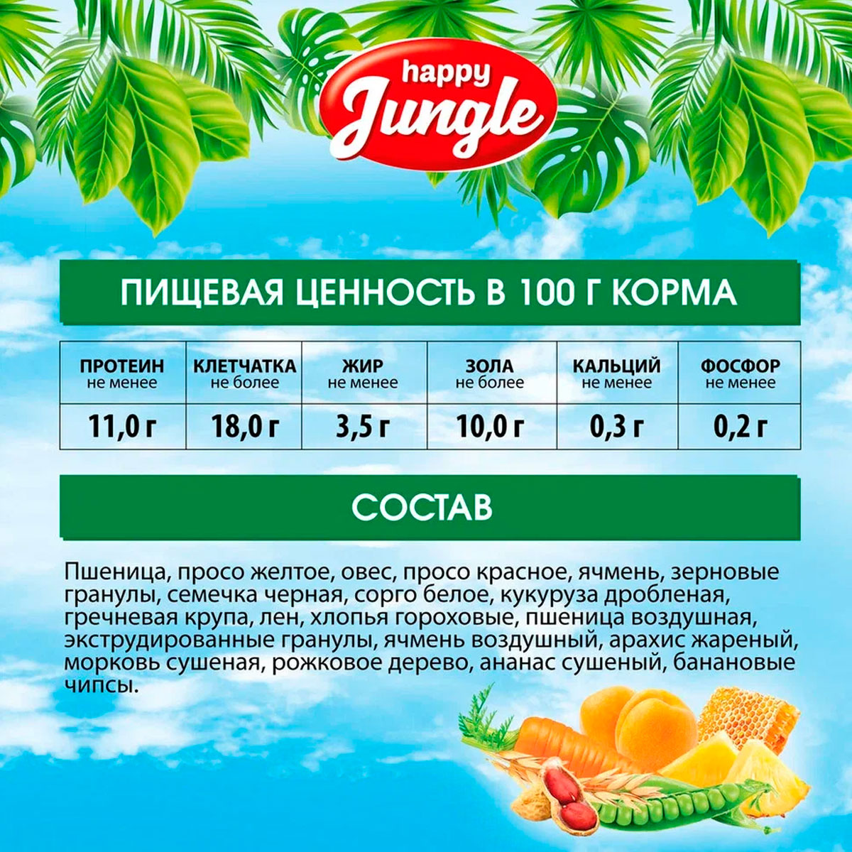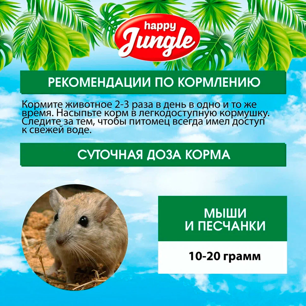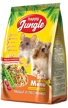 Корм HAPPY JUNGLE для мышей и песчанок – это сбалансированная смесь из зерна и зерновых гранул, овощей, фруктов и арахиса, которая обеспечит Вашего питомца всеми необходимыми питательными веществами.