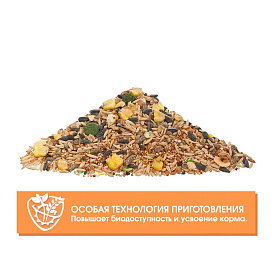 Сбалансированные смеси на основе зерна, трав, зерновых и травяных гранул с добавлением фруктов, овощей, ягод, арахиса и ракушечника обеспечат животное всеми необходимыми питательными веществами.