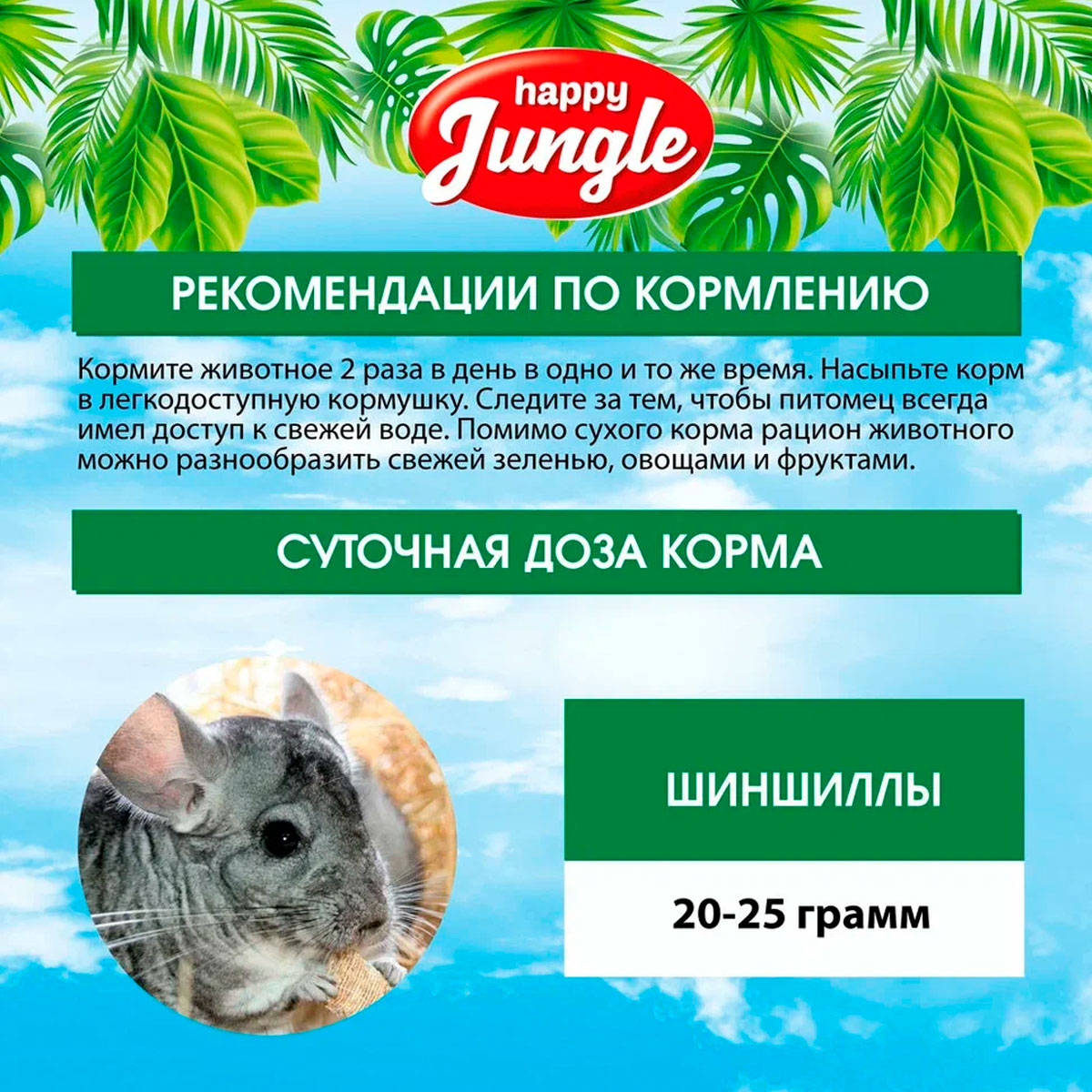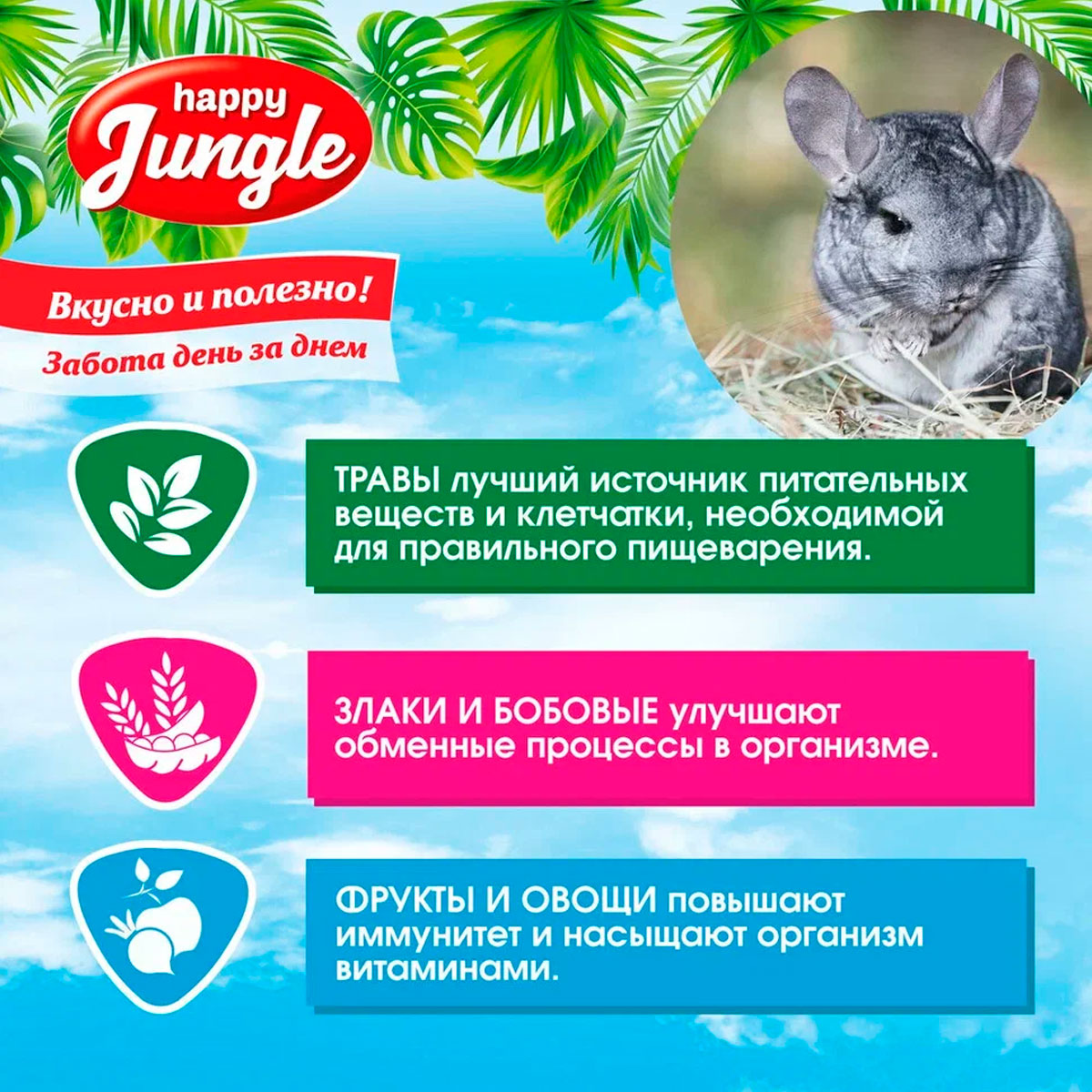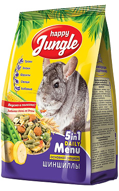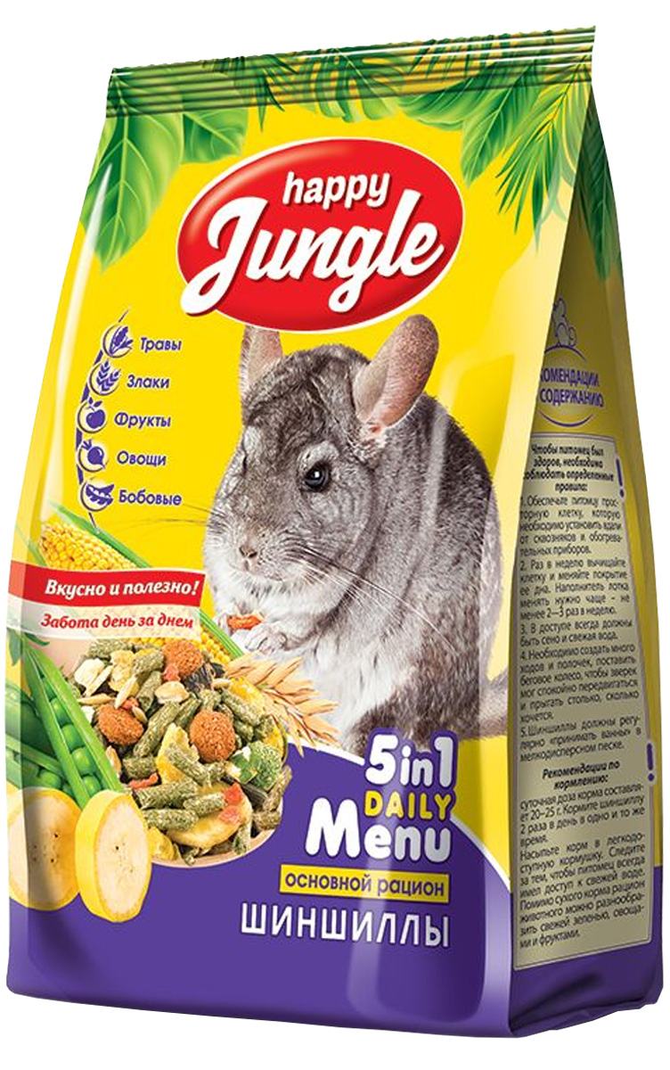 Корм HAPPY JUNGLE для шиншилл – это сбалансированная смесь из травяных гранул, зерна, овощей и фруктов, которая обеспечит Вашего питомца всеми необходимыми питательными веществами.