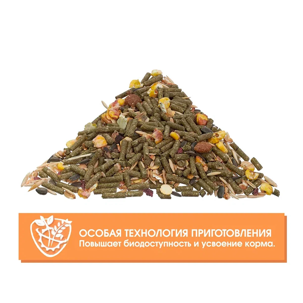 Сбалансированные смеси на основе зерна, трав, зерновых и травяных гранул с добавлением фруктов, овощей, ягод, арахиса и ракушечника обеспечат животное всеми необходимыми питательными веществами.