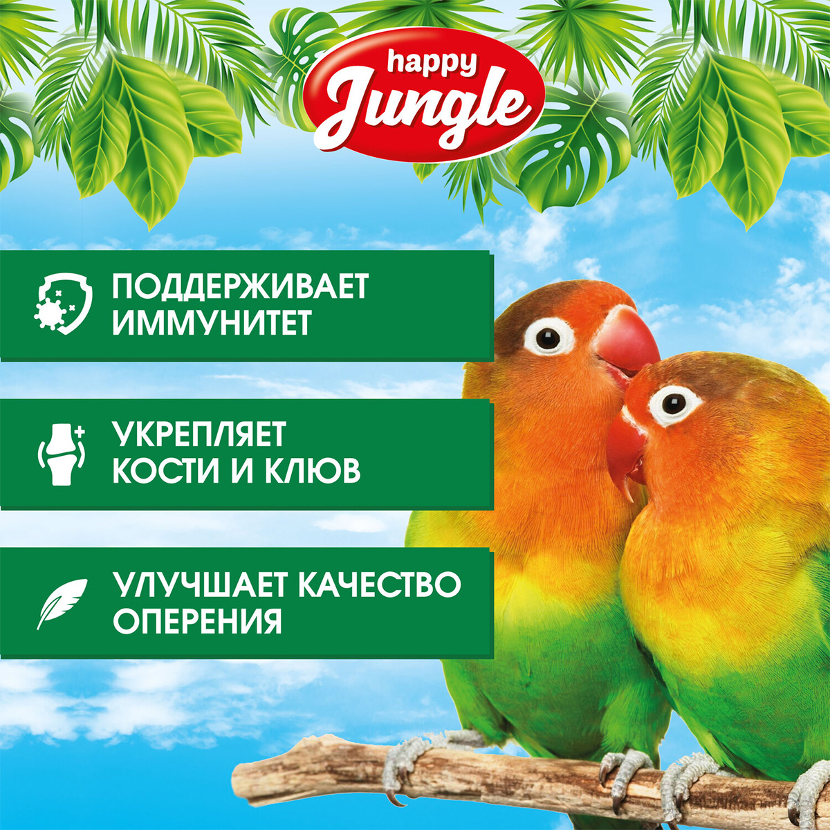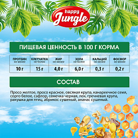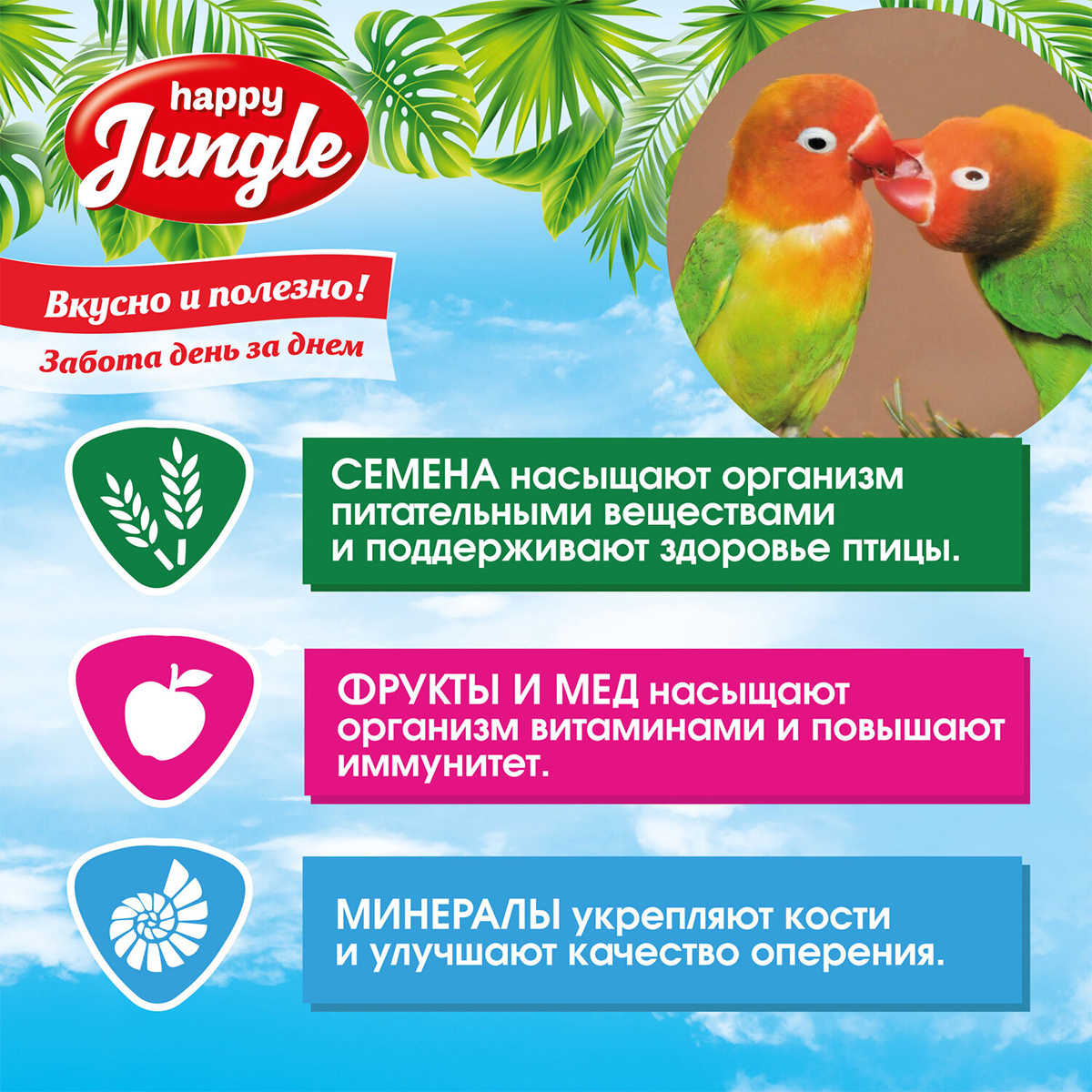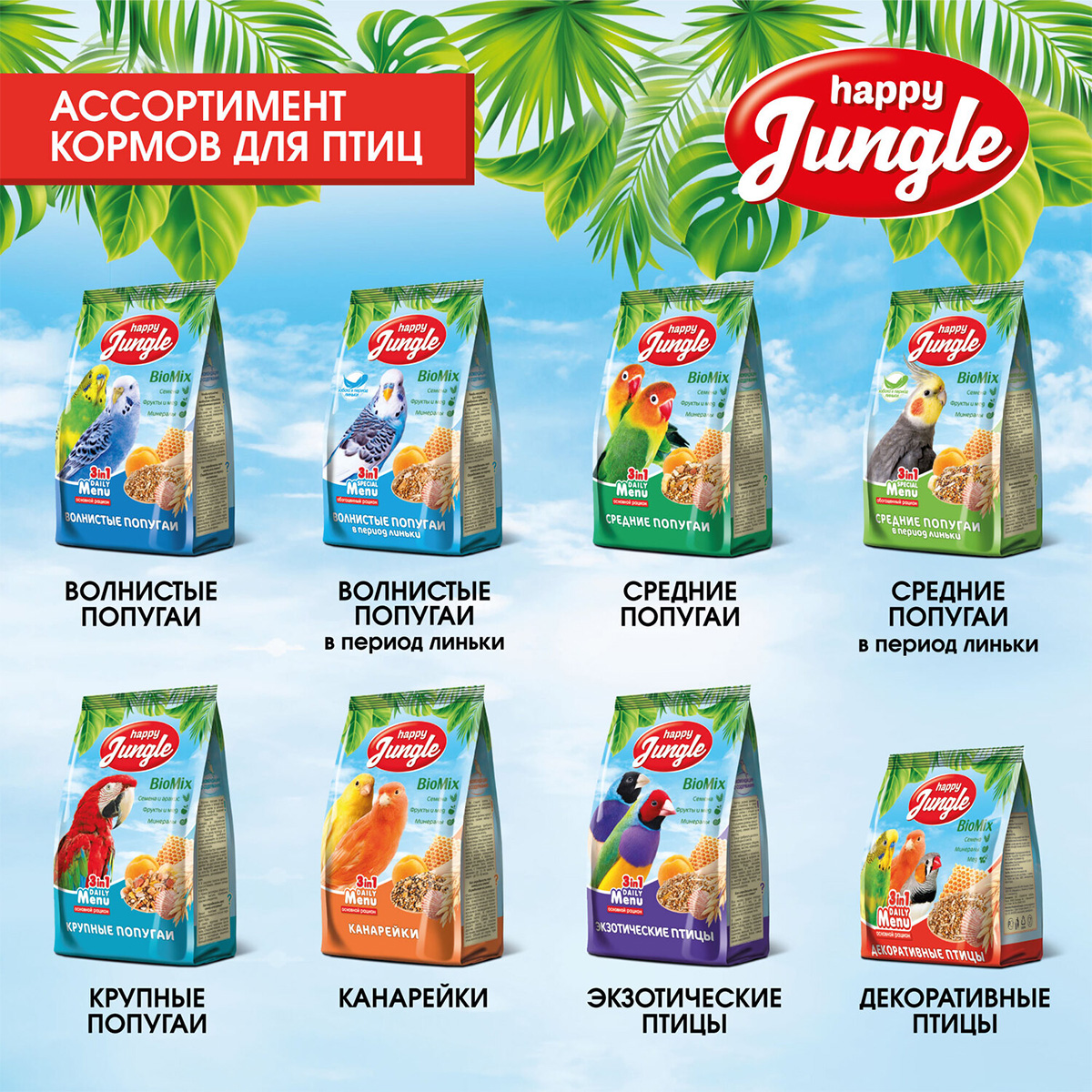 Корм HAPPY JUNGLE для средних попугаев – это сбалансированная смесь из зерна, фруктов и ракушечника, которая обеспечит птицу всеми необходимыми питательными веществами.