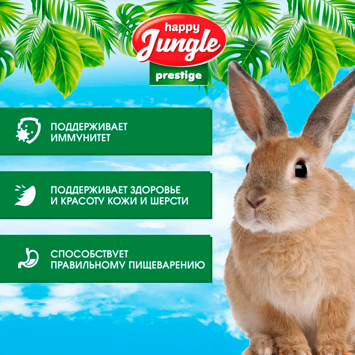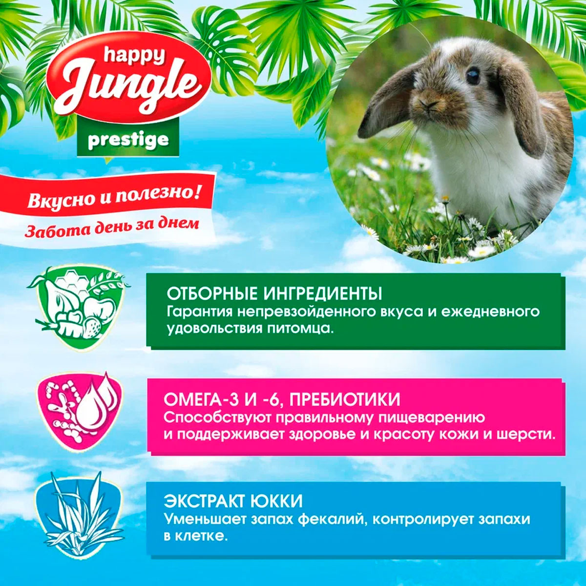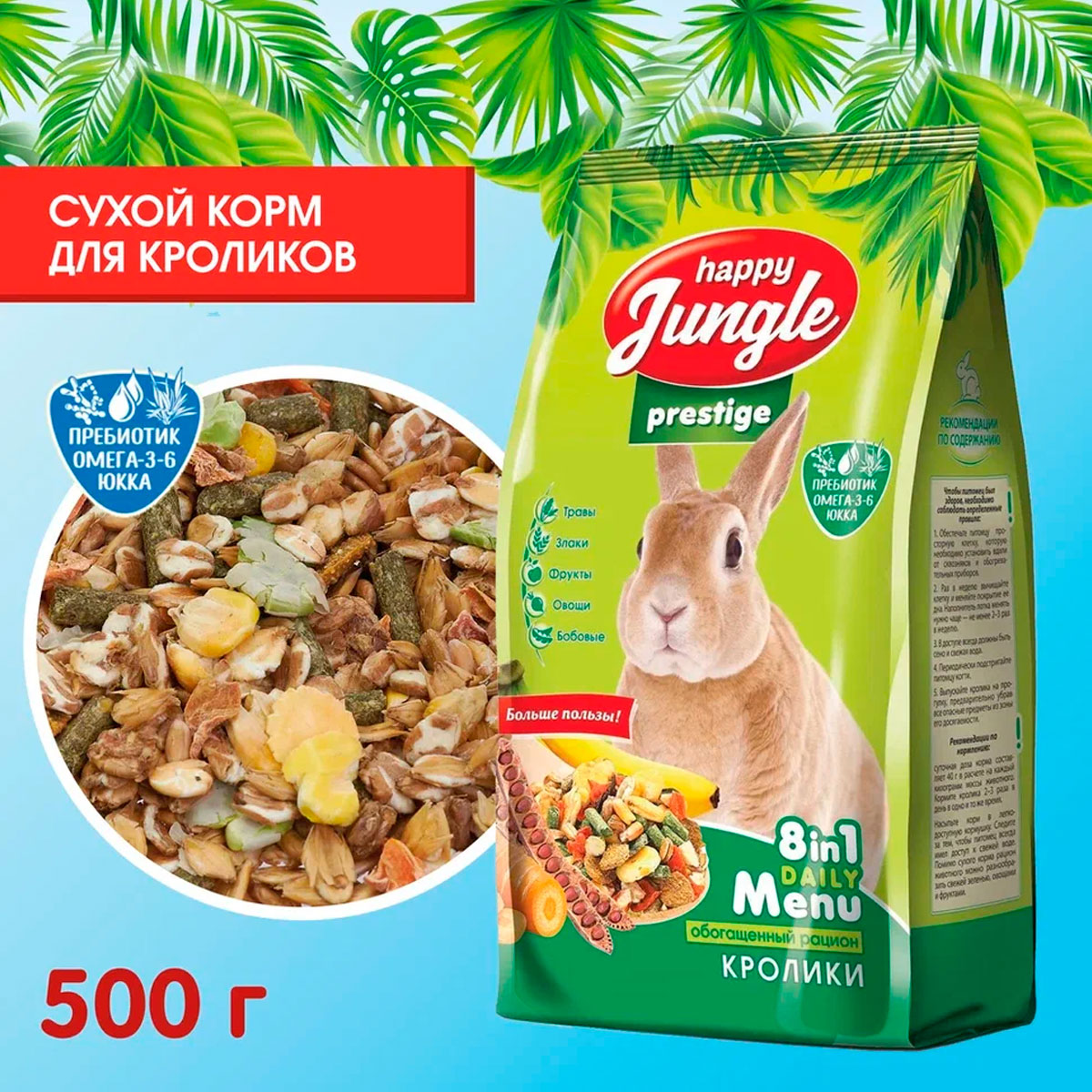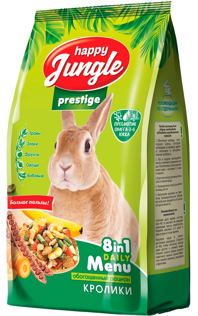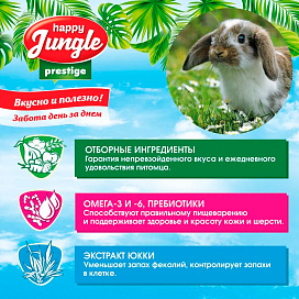 Корм для кроликов Happy Jungle Престиж – это корма, обогащенные пребиотиком, Омега -3, -6 и Юккой.