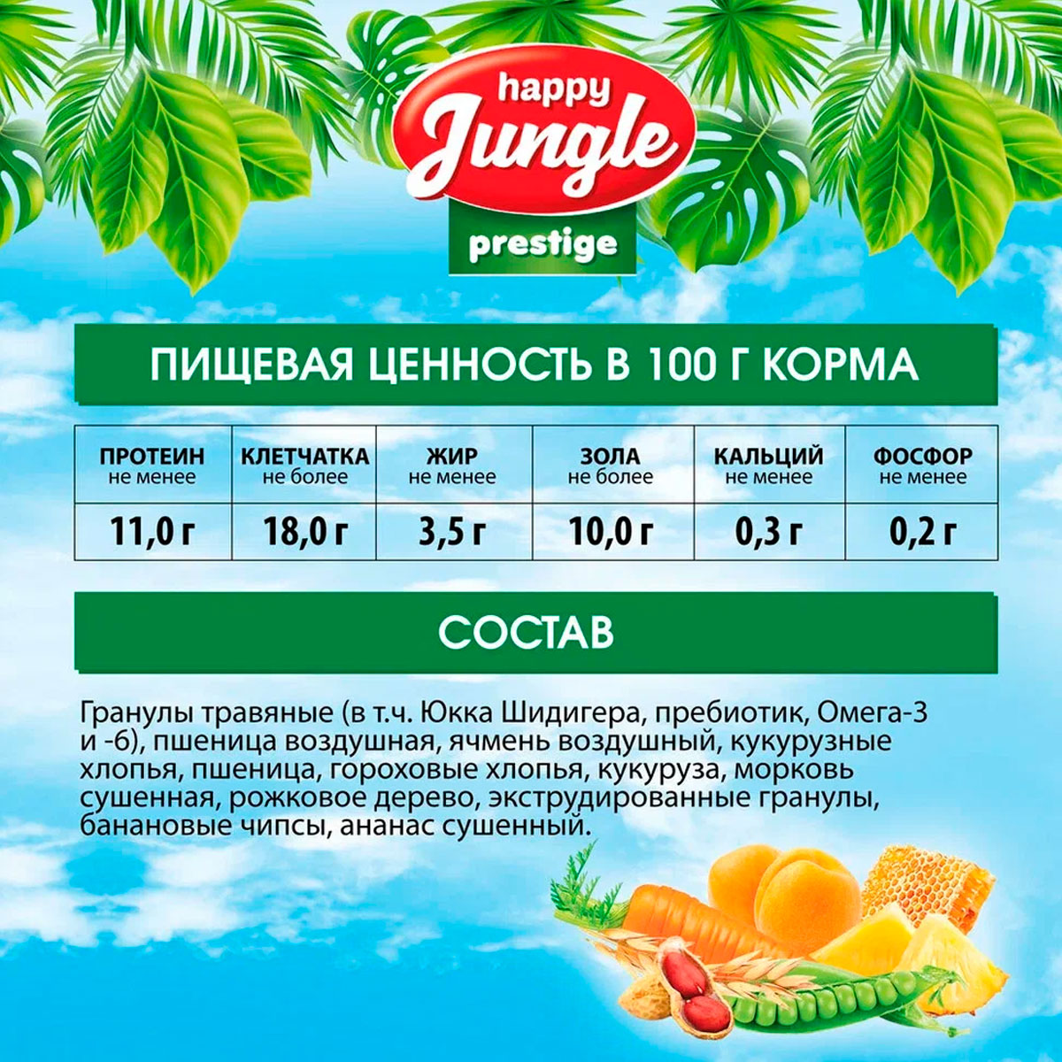 Гранулы травяные (в т.ч. Юкка Шидигера, пребиотик, Омега-3 и -6), пшеница воздушная, ячмень воздушный, кукурузные хлопья, пшеница, гороховые хлопья, кукуруза, морковь сушенная, рожковое дерево, экструдированные гранулы, банановые чипсы, ананас сушенный.