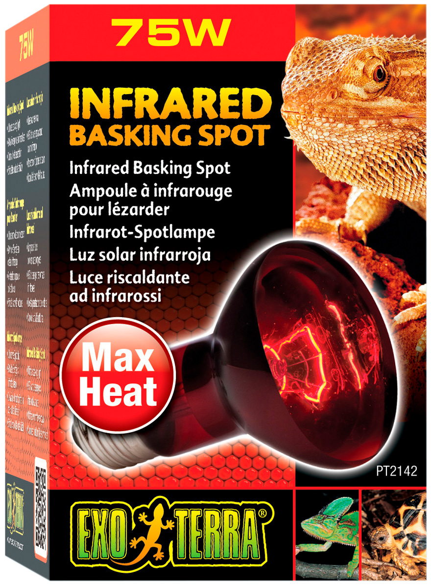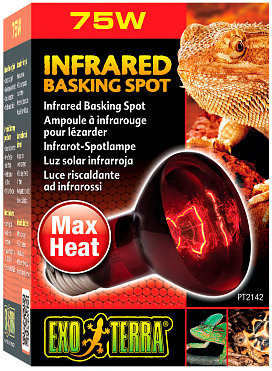 Инфракрасная лампа Exo Terra Infrared Basking Spot для рептилий.Инфракрасные лампы Exo Terra являются идеальными лампами для точечного обогрева. Эти лампы оснащены встроенным отражателем, позволяющим направлять тепловой поток на требуемый участок террариума. Они не нарушают световой режим животных из-за красного стекла, пропускающего лишь инфракрасное излучение, продуцируемое специальной спиралью, поэтому данные лампы зачастую используются как 24-часовой источник тепла.