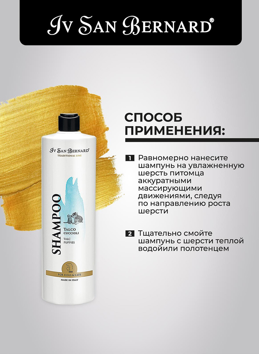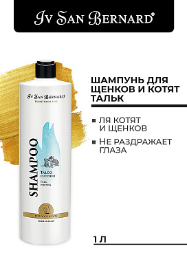 Шампунь Iv San Bernard TRADITIONAL LINE TALCO SHAMPOO разработан специально для растущей нежной шерстки щенков и котят.