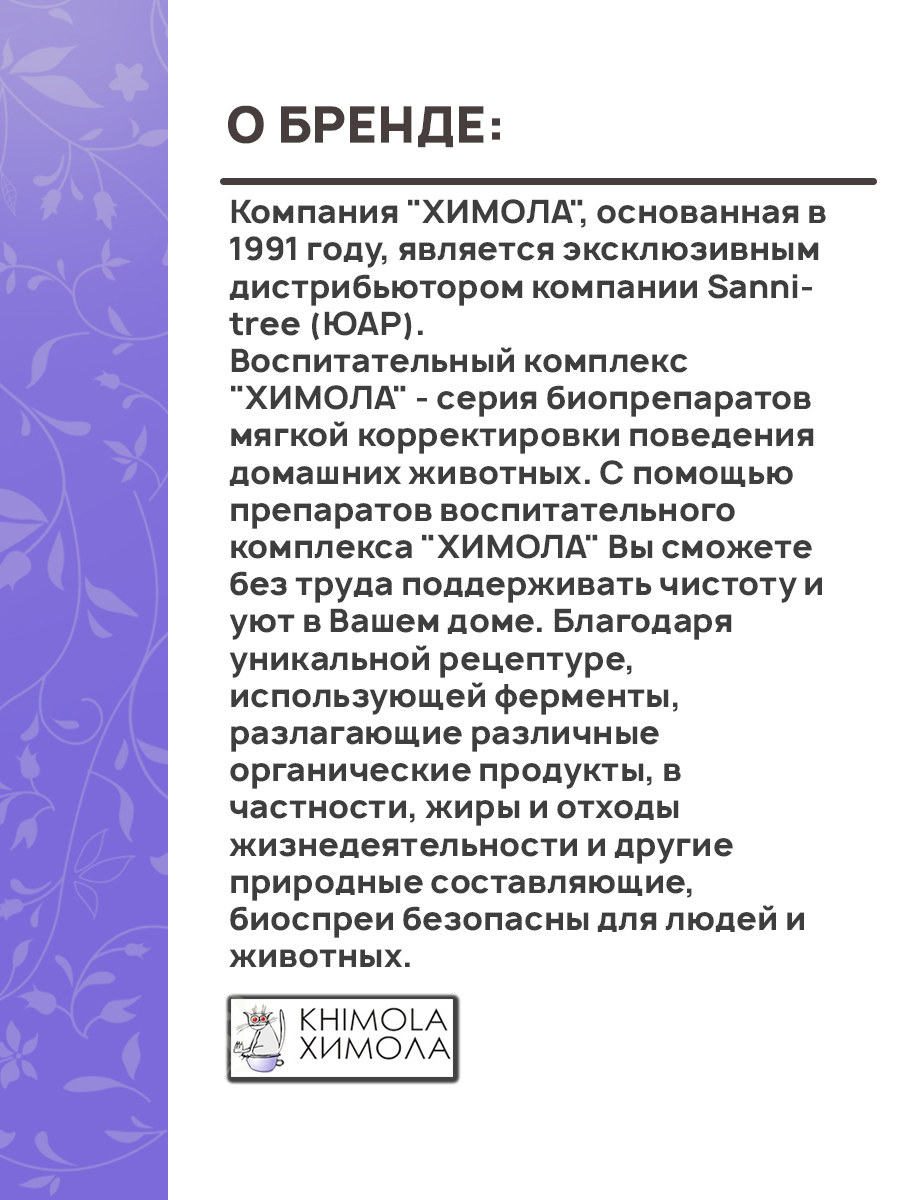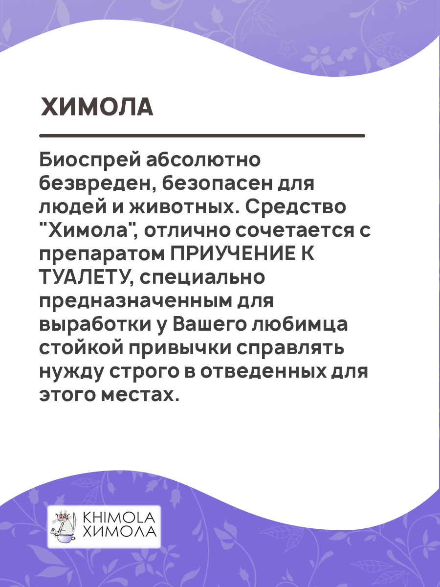 Биоспрей абсолютно безвреден, безопасен для людей и животных. Средство "Химола", отлично сочетается с препаратом ПРИУЧЕНИЕ К ТУАЛЕТУ, специально предназначенным для выработки у Вашего любимца стойкой привычки справлять нужду строго в отведенных для этого местах.