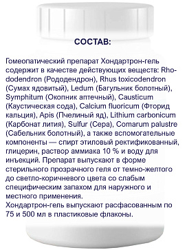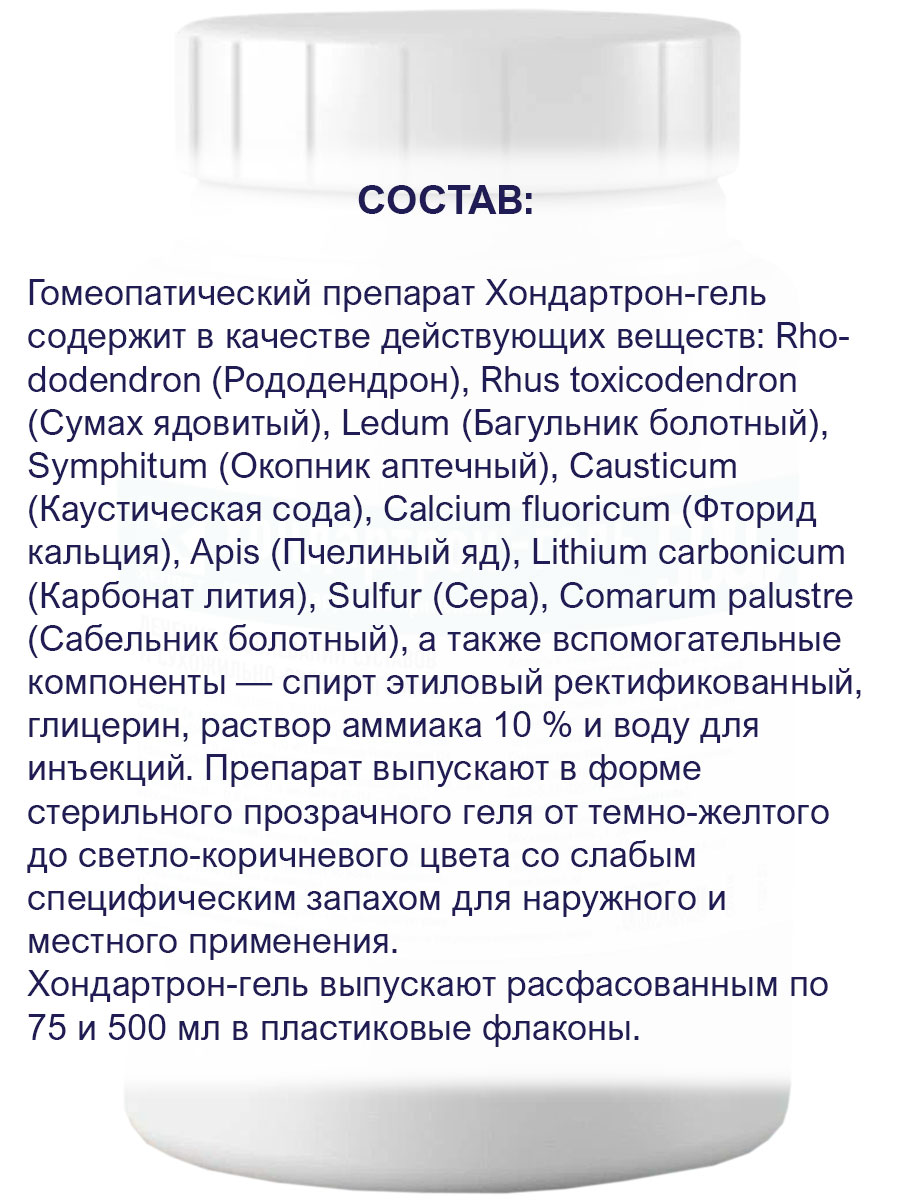 Гомеопатический препарат Хондартрон-гель содержит в качестве действующих веществ: Rhododendron (Рододендрон), Rhus toxicodendron (Сумах ядовитый), Ledum (Багульник болотный), Symphitum (Окопник аптечный), Causticum (Каустическая сода), Calcium fluoricum (Фторид кальция), Apis (Пчелиный яд), Lithium carbonicum (Карбонат лития), Sulfur (Сера), Comarum palustre (Сабельник болотный), а также вспомогательные компоненты — спирт этиловый ректификованный, глицерин, раствор аммиака 10 % и воду для инъекций. Препарат выпускают в форме стерильного прозрачного геля от темно-желтого до светло-коричневого цвета со слабым специфическим запахом для наружного и местного применения. Хондартрон-гель выпускают расфасованным по 75 и 500 мл в пластиковые флаконы.