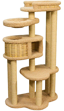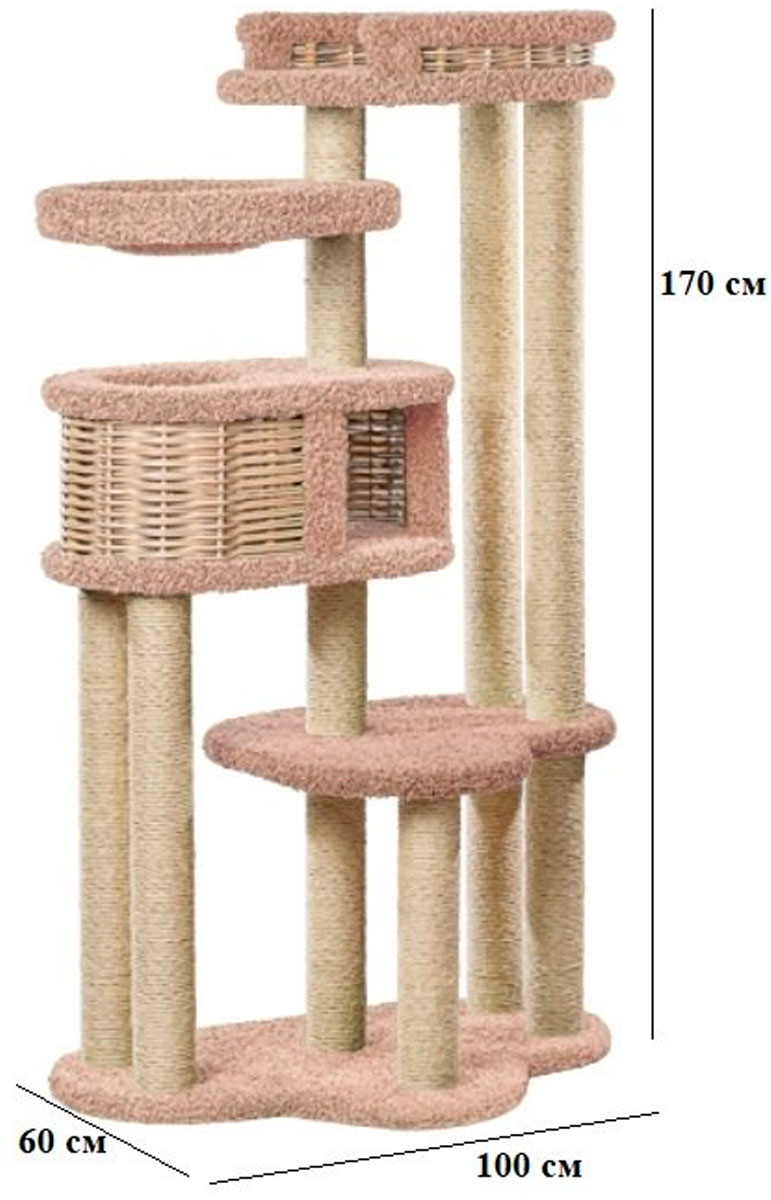 Комплекс Басик+ от компании «Пушок» – очень функциональный, обитый ковролином и оснащенный большим количеством когтеточек комплекс. Наверху лежанка с плетеными стенками и уютный гамак, откуда так интересно наблюдать за происходящими вокруг событиями! Посередине – большой уютный плетеный домик, где так хорошо поспать или просто спрятаться. Внизу большая ступенька, которую также можно использовать как место для сна и отдыха и как пункт наблюдения.