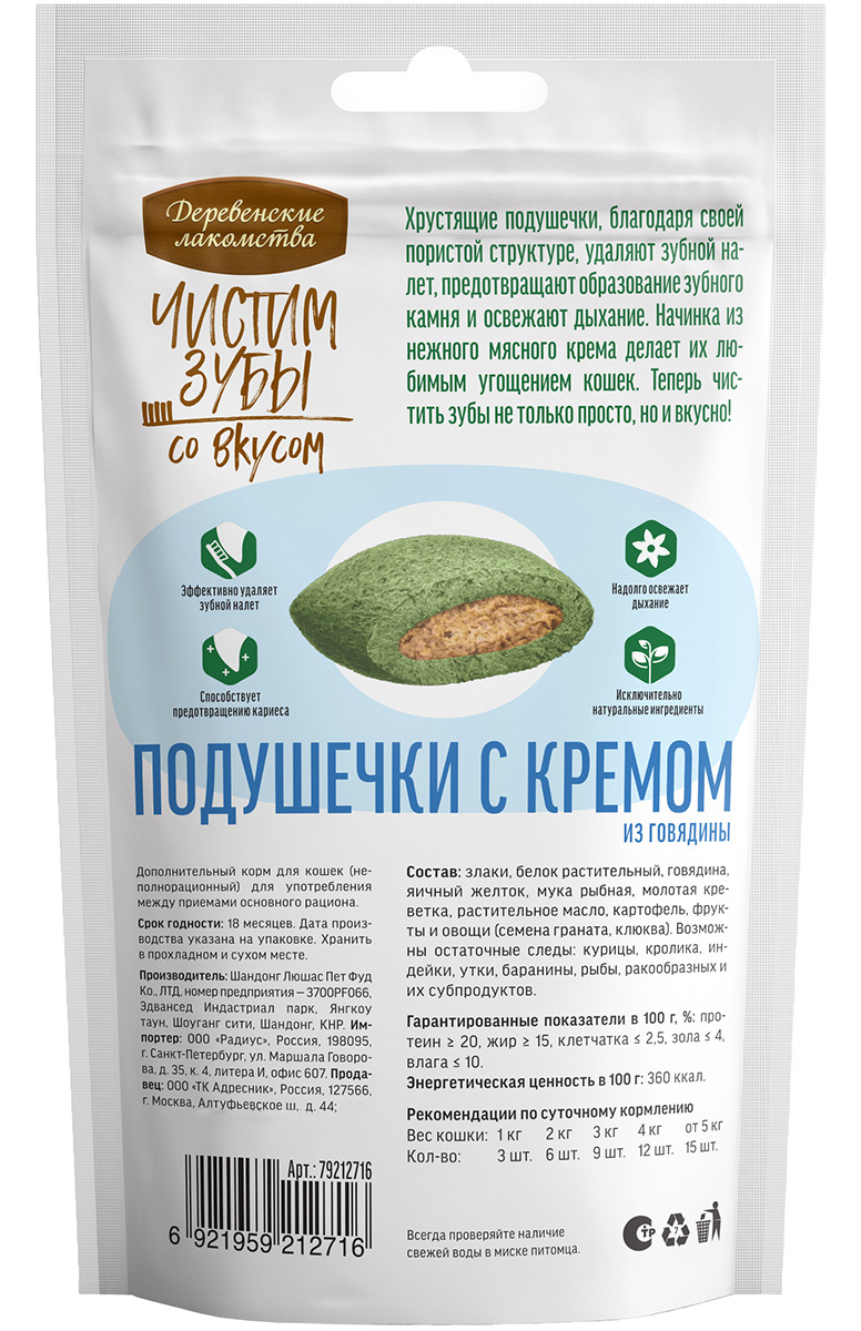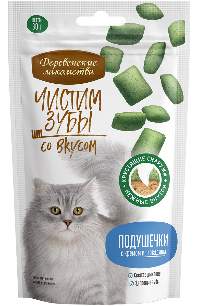 Лакомства для кошек ДЕРЕВЕНСКИЕ ЧИСТИМ ЗУБЫ подушечки с кремом говядина 30 гр (1 шт)