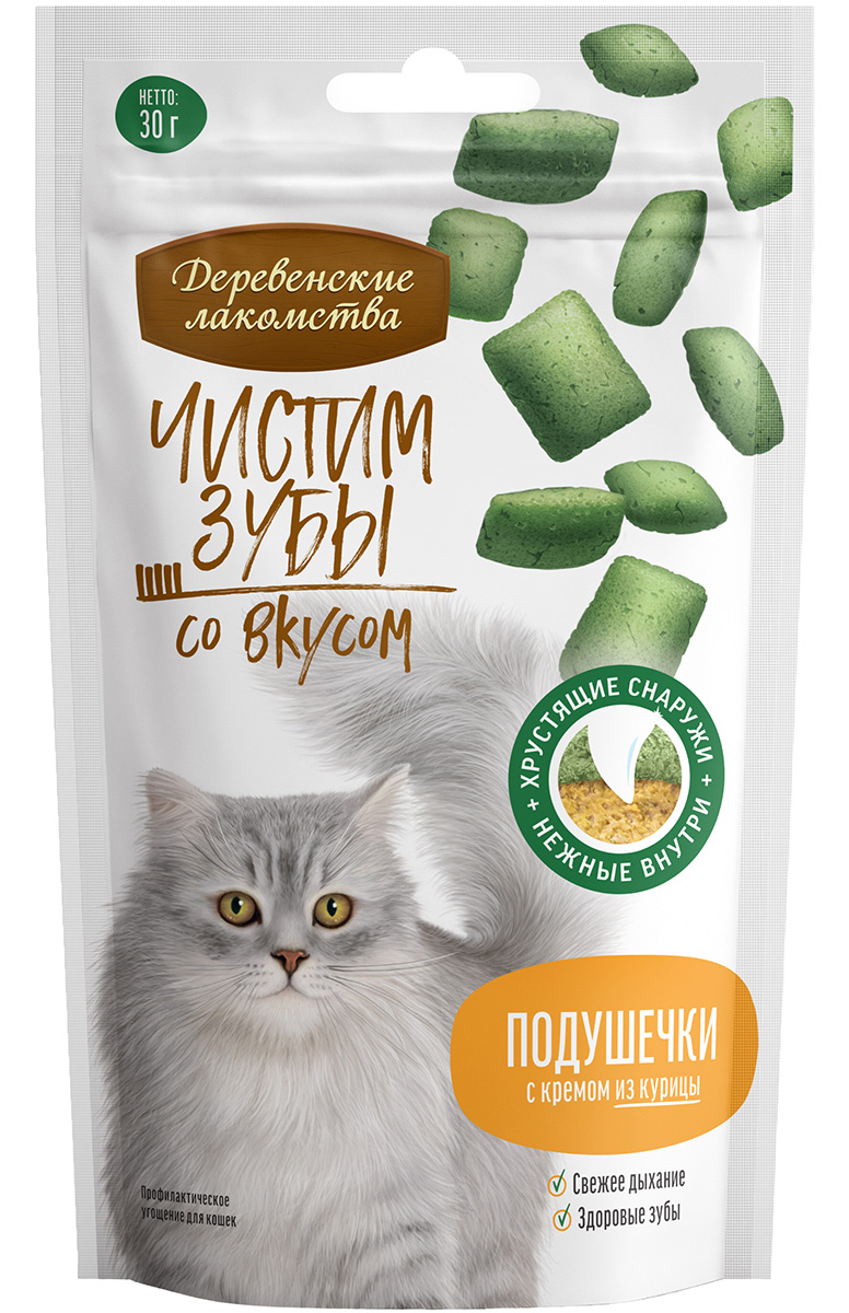 Лакомства для кошек ДЕРЕВЕНСКИЕ ЧИСТИМ ЗУБЫ подушечки с кремом курица 30 гр (1 шт)