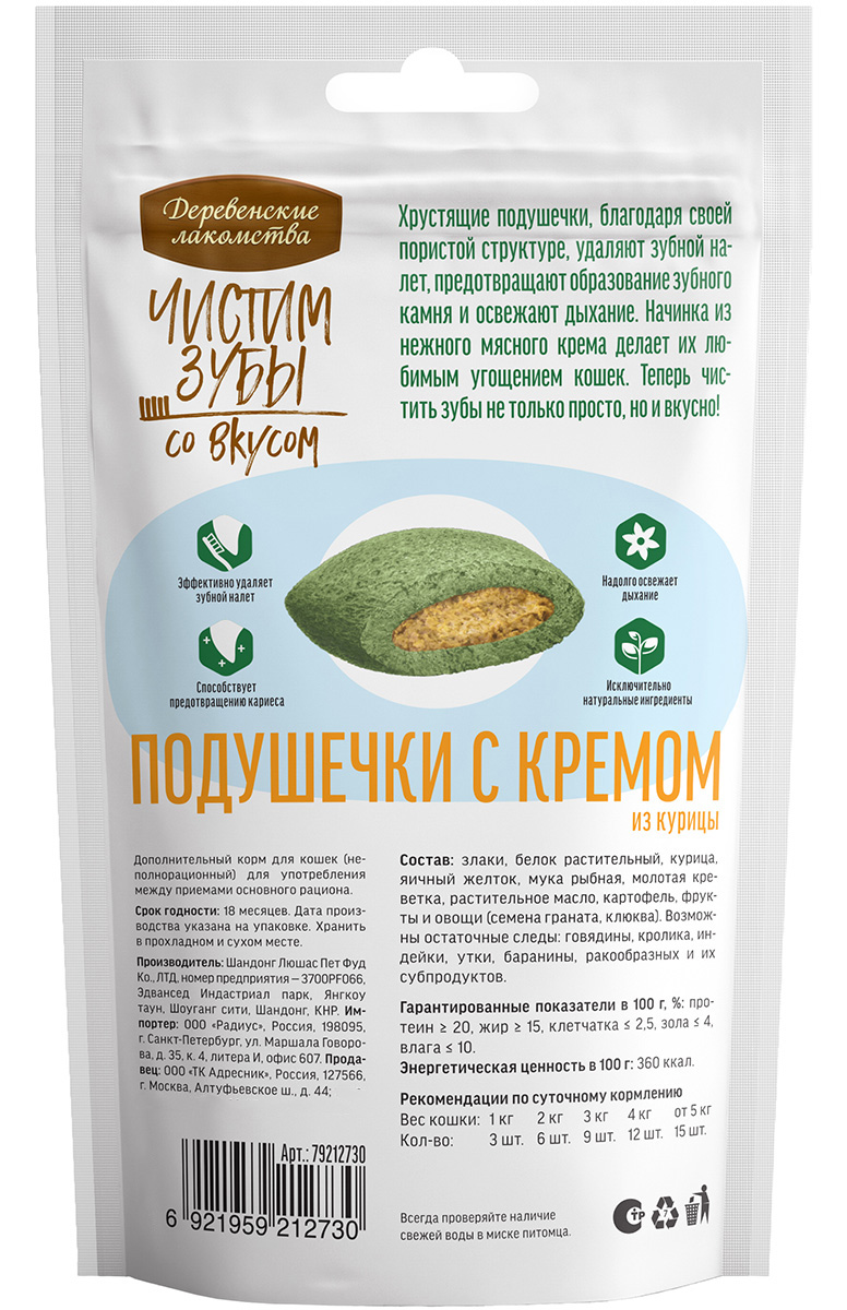 Хрустящие подушечки, благодаря своей пористой структуре, удаляют зубной налёт, предотвращают образование зубного камня и освежают дыхание.